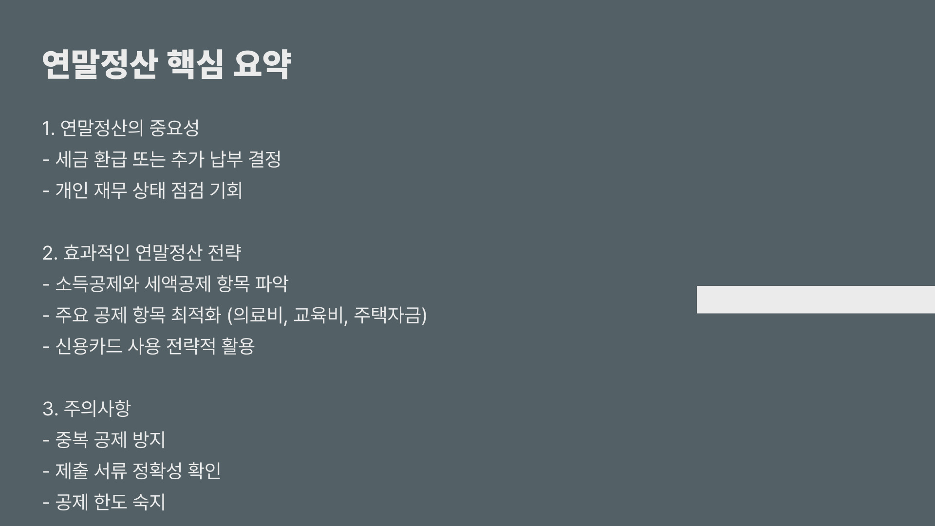 연말정산의 가장 큰 목적은 과세표준을 줄이는 것입니다. 이를 위해 한 해 동안 어떤 소득이 발생했는지를 명확히 파악하고, 각종 소득 공제를 적극적으로 활용해야 합니다. 소득 공제 항목을 잘 활용하면 세금을 더 절감할 수 있습니다.