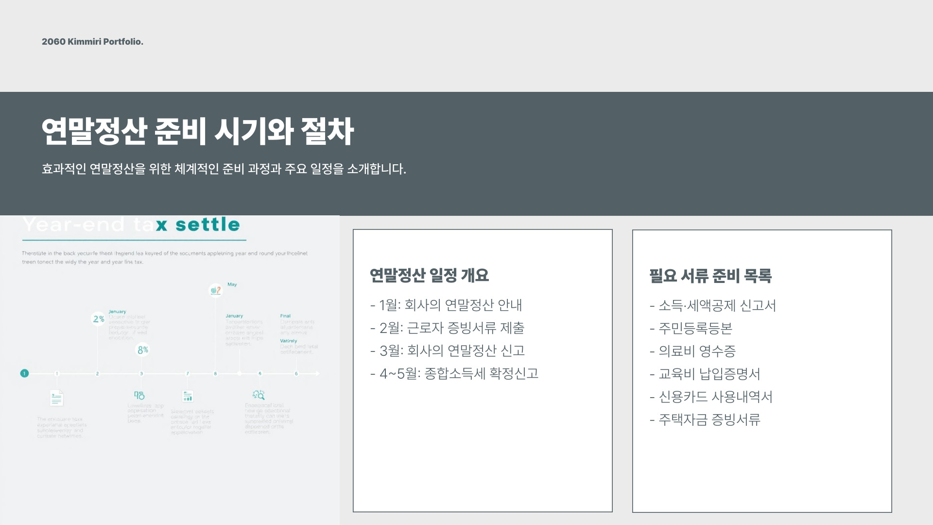 연말정산을 준비할 때 필요한 서류를 미리 준비하는 것이 중요합니다. 소득증명서, 지출증명서, 세액공제 증명서 등 다양한 서류가 필요할 수 있습니다.