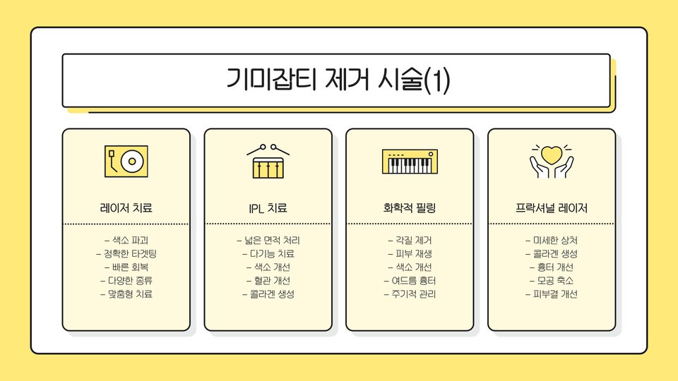 기미잡티 치료에는 여러 가지 방법이 있습니다. 기본적으로는 전문의와 상담하여 본인에게 적합한 방법을 찾는 것이 중요합니다. 대표적인 방법으로는 레이저 치료, 화학 박피, 그리고 미세침 시술 등이 있습니다.