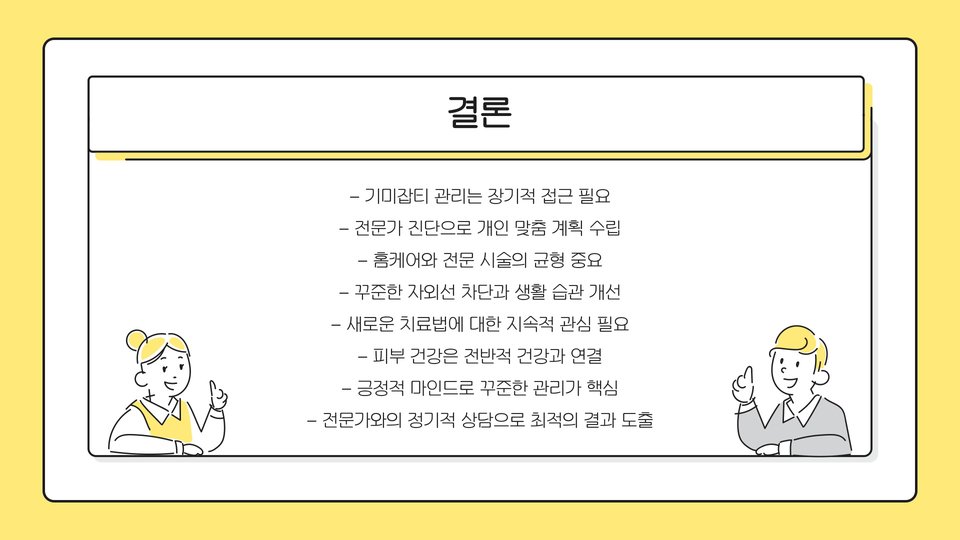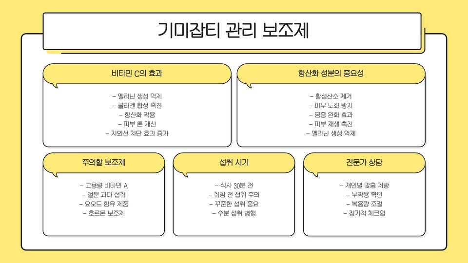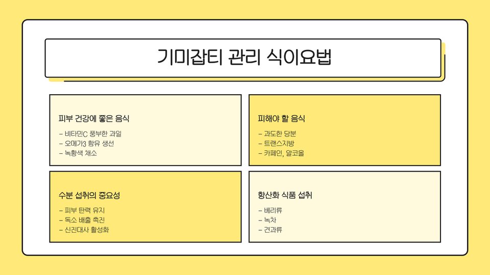 기미잡티는 많은 사람들에게 고민거리가 될 수 있지만, 적절한 관리와 예방 방법을 통해 효과적으로 개선할 수 있습니다. 자외선 차단제 사용과 함께 비타민 C가 포함된 제품을 활용하며, 필요에 따라 전문적인 치료를 고려하는 것이 좋습니다. 중요한 것은 꾸준한 관리와 올바른 제품 선택입니다. 전문가의 조언을 받아 자신에게 맞는 방법을 찾는 것이 기미잡티를 극복하는 첫걸음이 될 것입니다.
