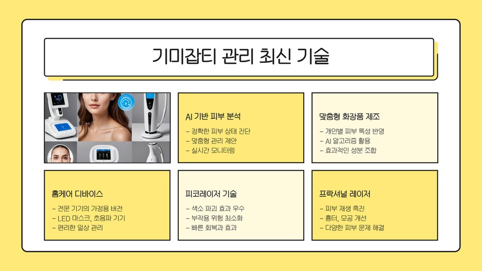 기미잡티를 제거하기 위한 방법은 다양합니다. 그 중에서도 레이저 치료, 필링, 미백 크림 등이 인기가 많습니다. 레이저 치료는 피부의 깊은 층까지 영향을 미쳐 멜라닌 세포를 파괴하는 효과가 있습니다. 이 방법은 빠른 결과를 기대할 수 있지만, 비용이 비쌀 수 있습니다.