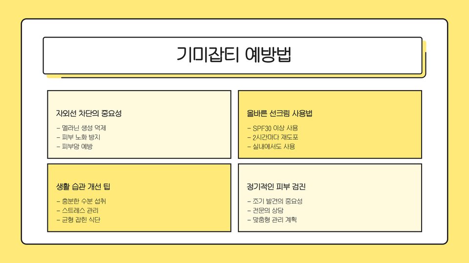 기미잡티의 예방과 치료를 위해서는 적절한 피부 관리가 필수적입니다. 자외선 차단제의 사용이 가장 기본적인 방법이며, 피부의 수분과 영양을 공급하는 제품을 사용해야 합니다. 특히, 비타민 C가 함유된 제품은 멜라닌 생성을 억제하고 피부 톤을 밝게 하는 데 도움을 줄 수 있습니다. 이를 통해 기미잡티의 발생을 예방할 수 있습니다.