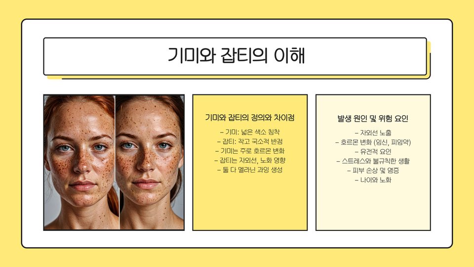 기미와 잡티 문제는 다양한 요인으로 인해 발생할 수 있으며, 전문가의 도움이 필요할 때 적절한 선택과 관리를 통해 해결할 수 있습니다. 이 가이드를 바탕으로 기미잡티 문제를 효과적으로 해결하길 바랍니다.