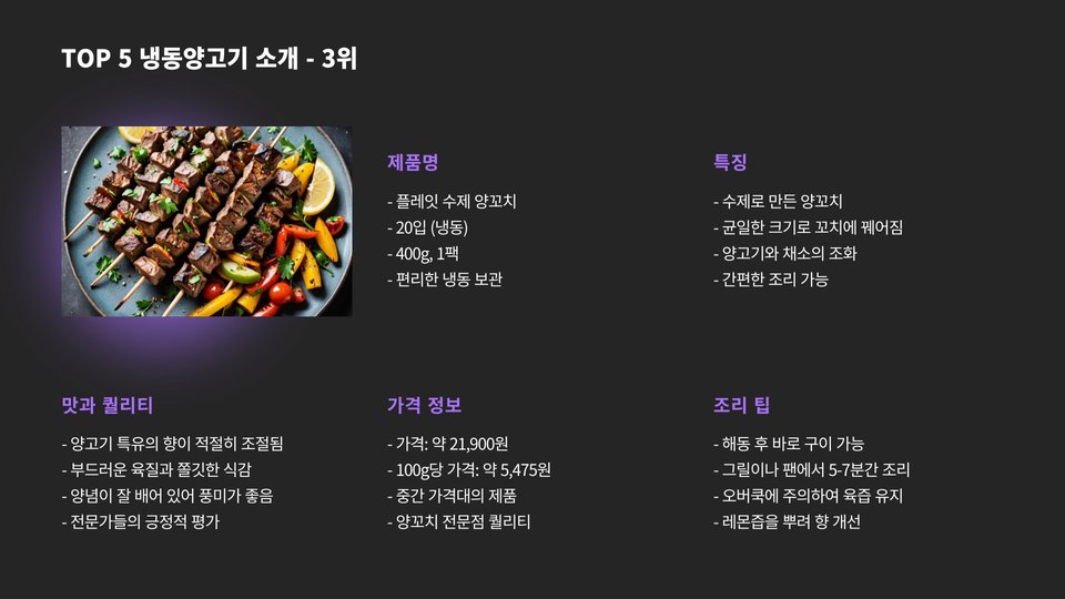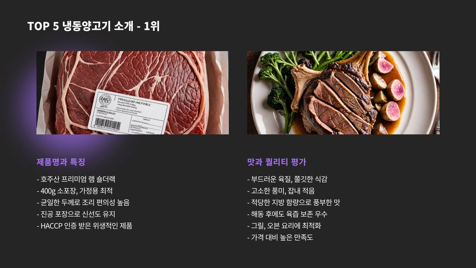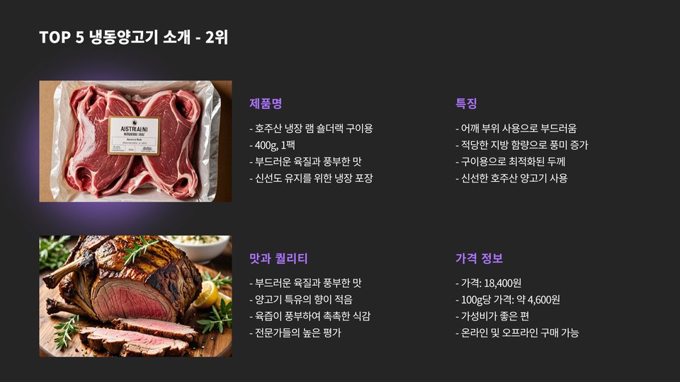 이제 본격적으로 냉동양고기 TOP 5를 소개하겠습니다. 각각의 제품은 맛과 퀄리티를 기준으로 선정되었으며, 소비자들의 리뷰와 전문가의 추천을 바탕으로 하였습니다. 이 리스트는 다양한 요리 방법과 조리 스타일을 고려하여 작성되었습니다.