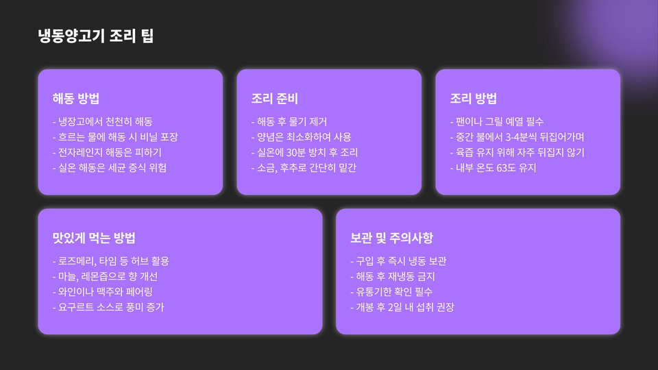 노하우: 냉동양고기를 해동할 때는 냉장고에서 천천히 해동하는 것이 가장 좋습니다. 이렇게 하면 고기의 질감과 맛을 유지할 수 있습니다.