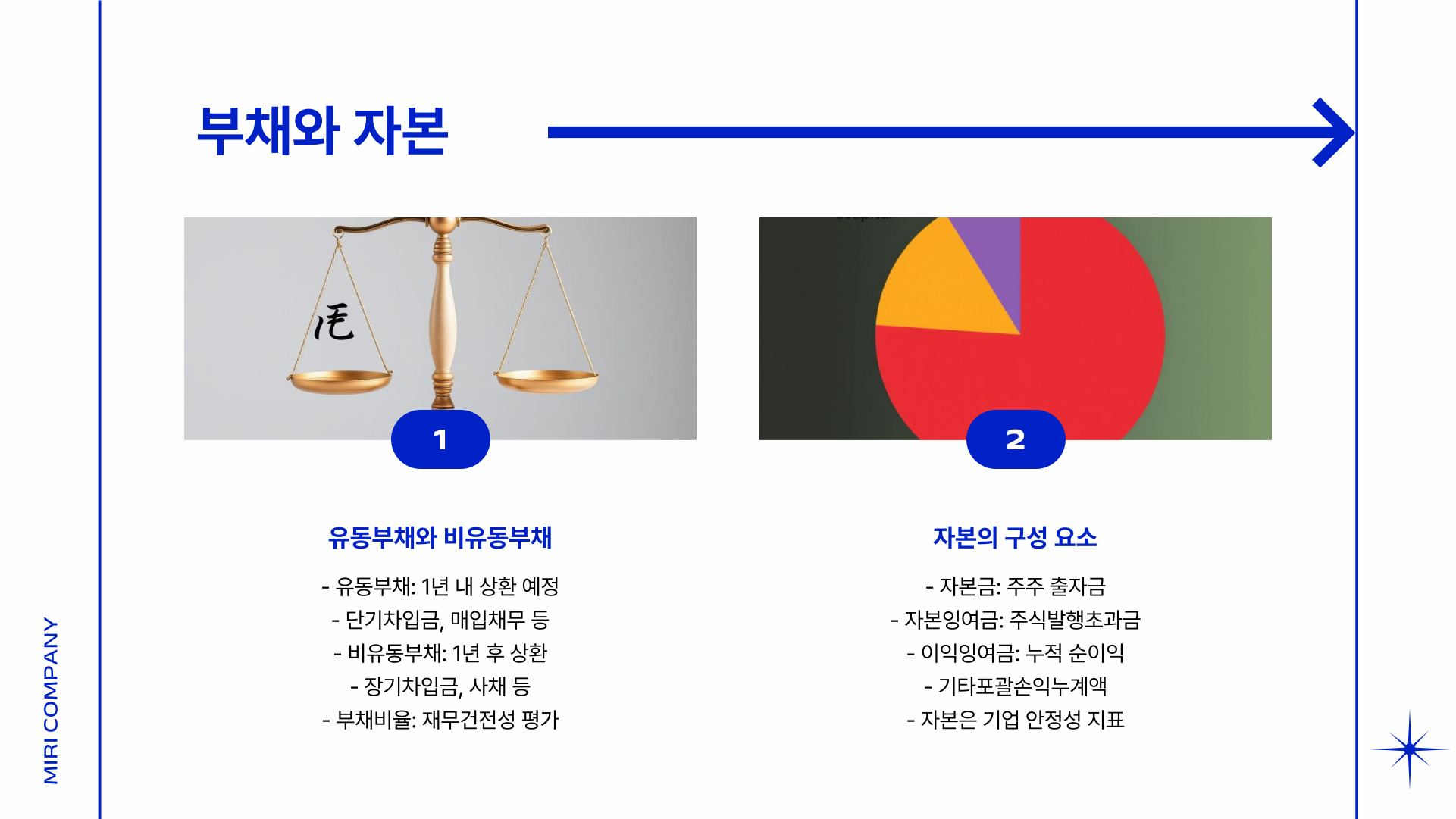 부채는 기업이 외부에 지고 있는 모든 채무를 포함하며, 이는 유동부채와 비유동부채로 나뉩니다. 유동부채는 1년 이내에 상환해야 하는 채무를, 비유동부채는 1년 이상 걸리는 채무를 의미합니다. 마지막으로 자본은 기업의 순자산을 나타내며, 주주가 투자한 금액과 기업의 이익잉여금을 포함합니다.