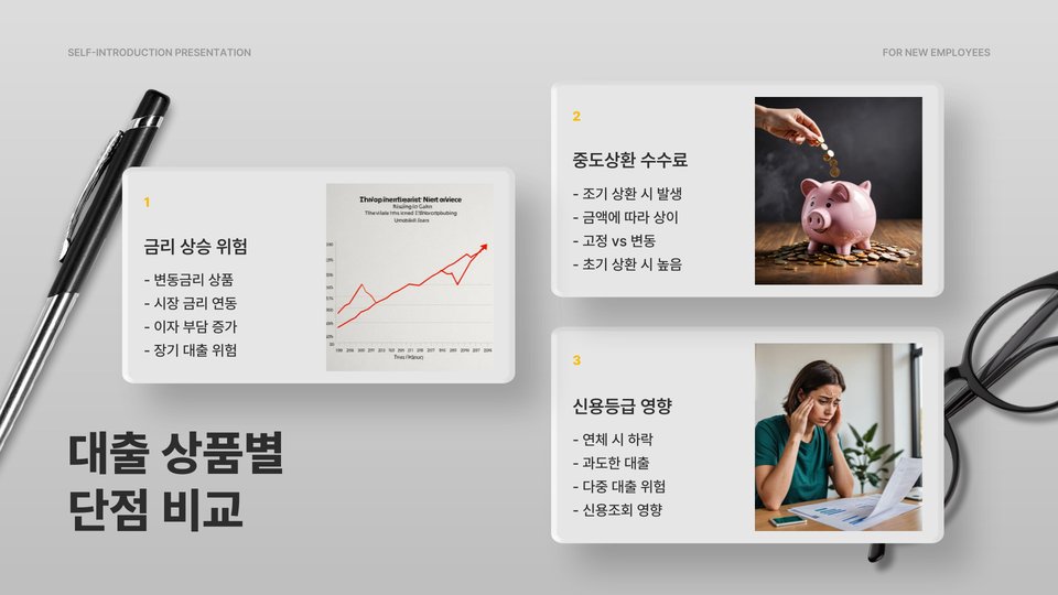 • 단점: 신용 점수에 의존, 상환 부담 증가