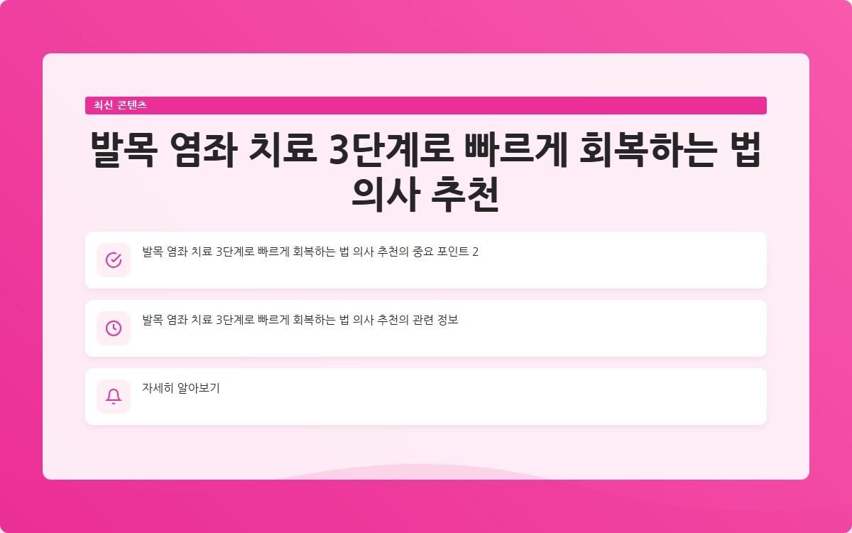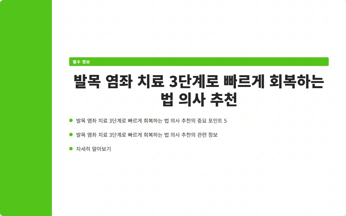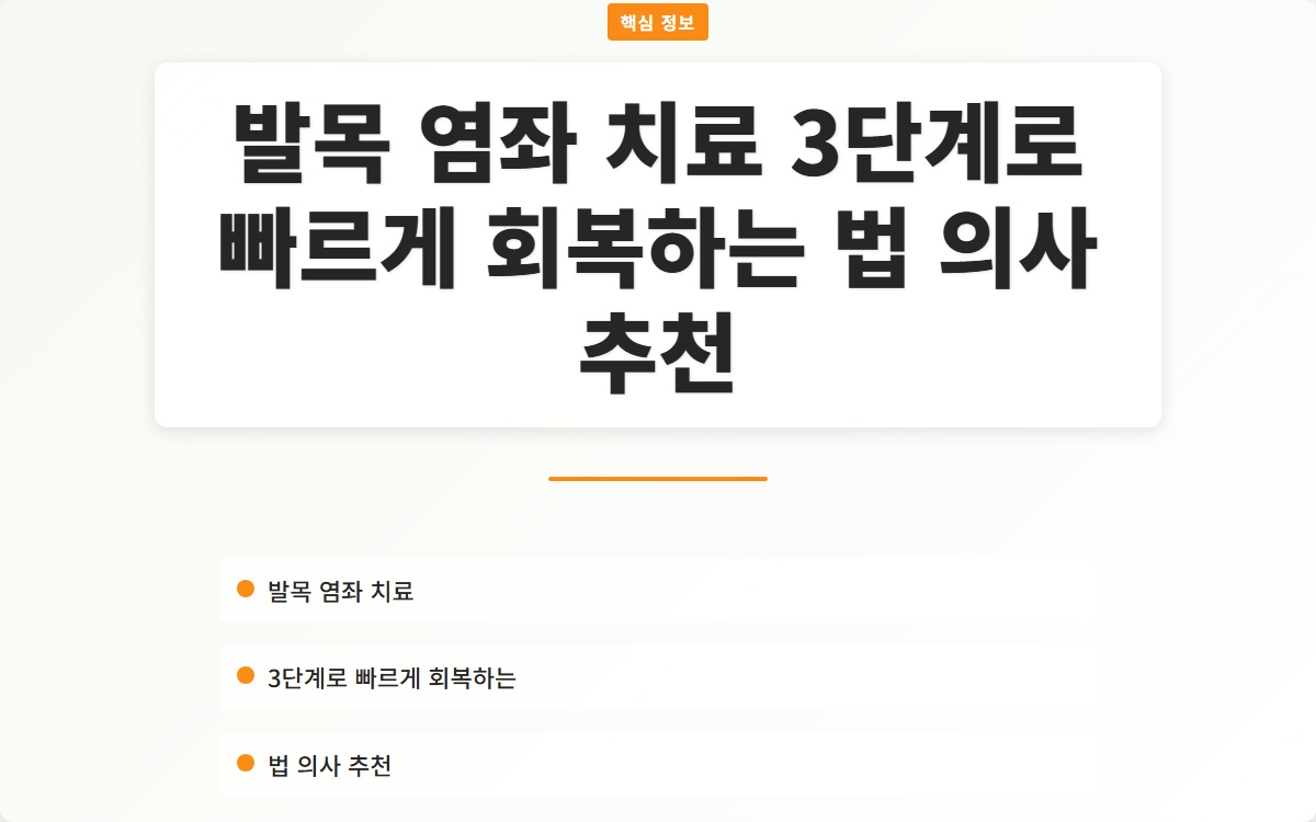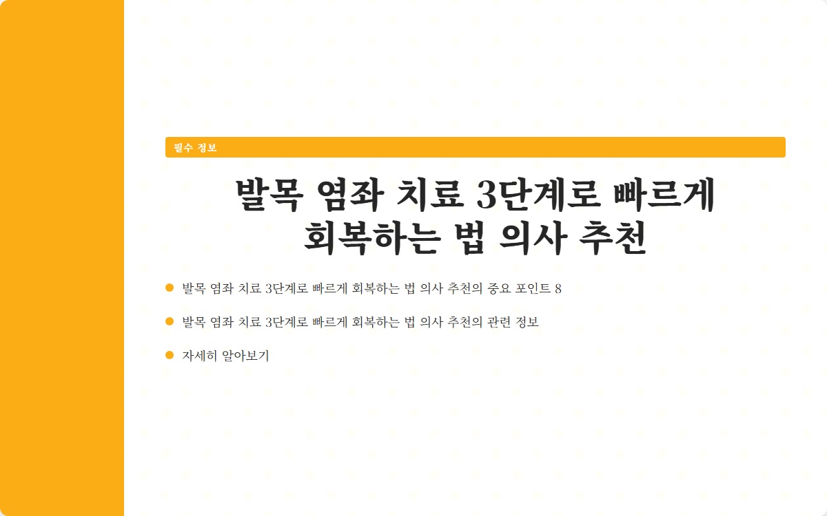 발목 염좌로 인한 통증은 많은 사람들에게 큰 불편을 초래합니다. 적절한 치료를 받지 않을 경우 만성적인 문제로 발전할 수 있습니다. 이번 포스트에서는 발목 염좌를 치료하기 위한 3단계 회복법을 소개합니다. 지금 확인해보세요!