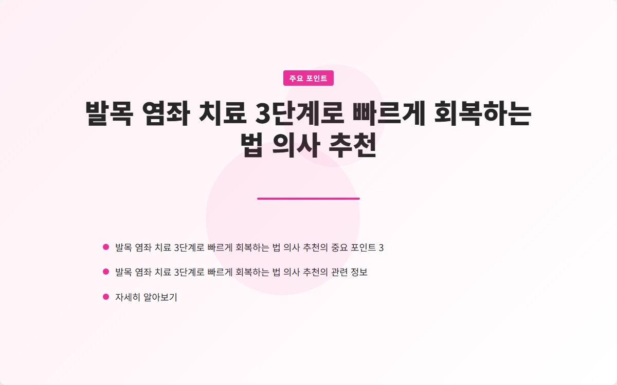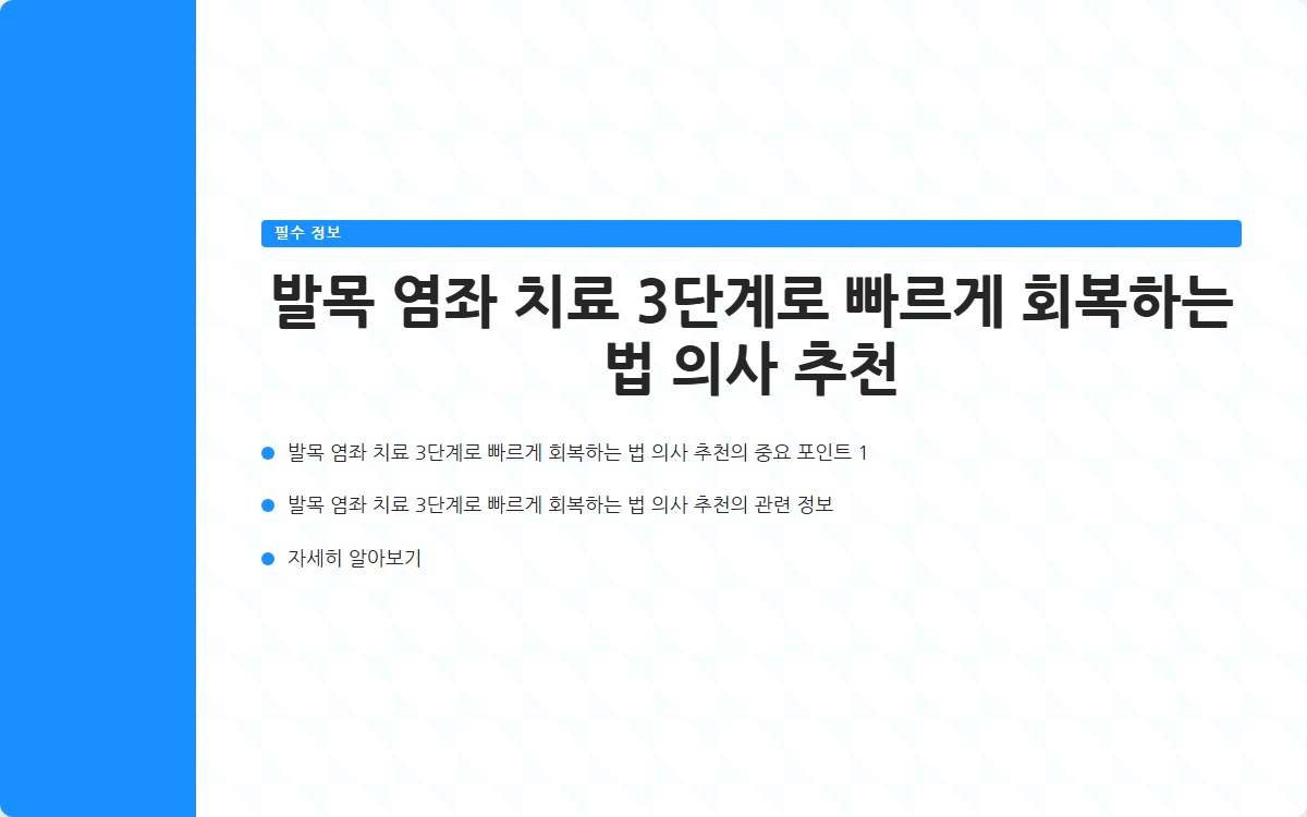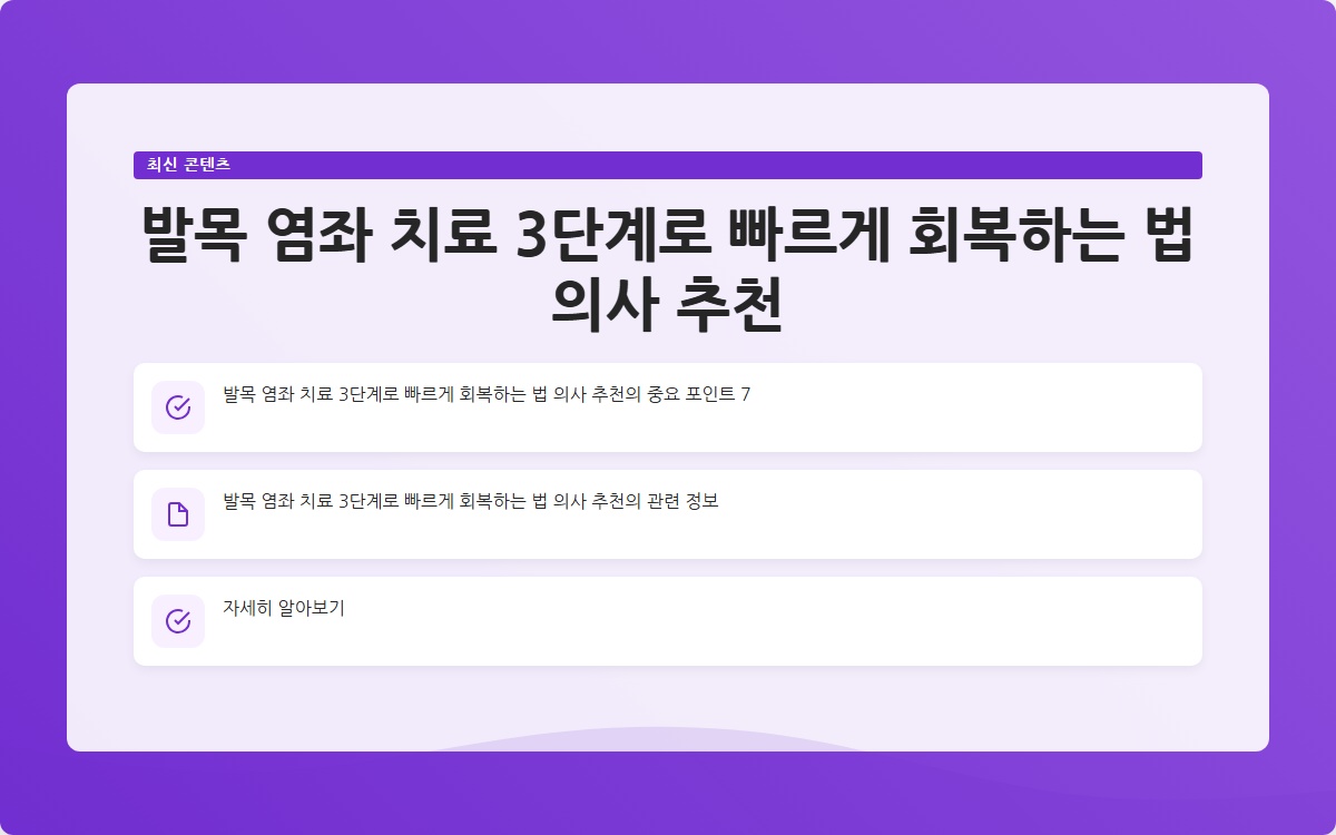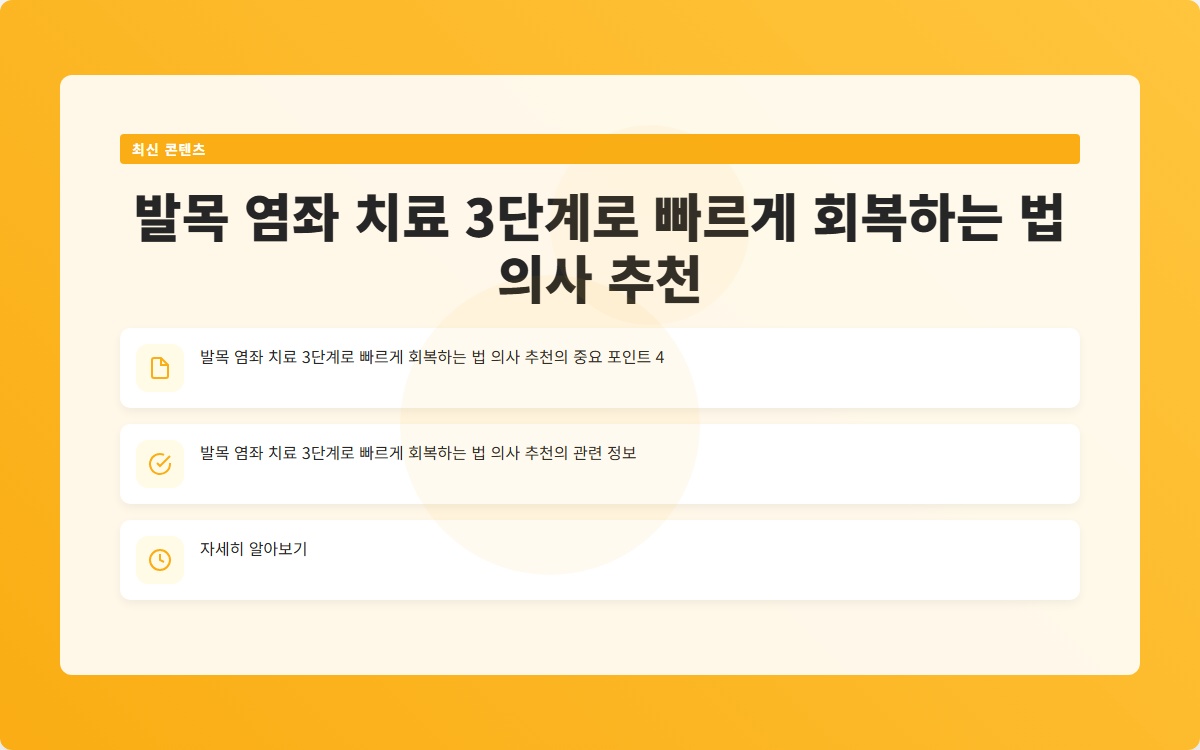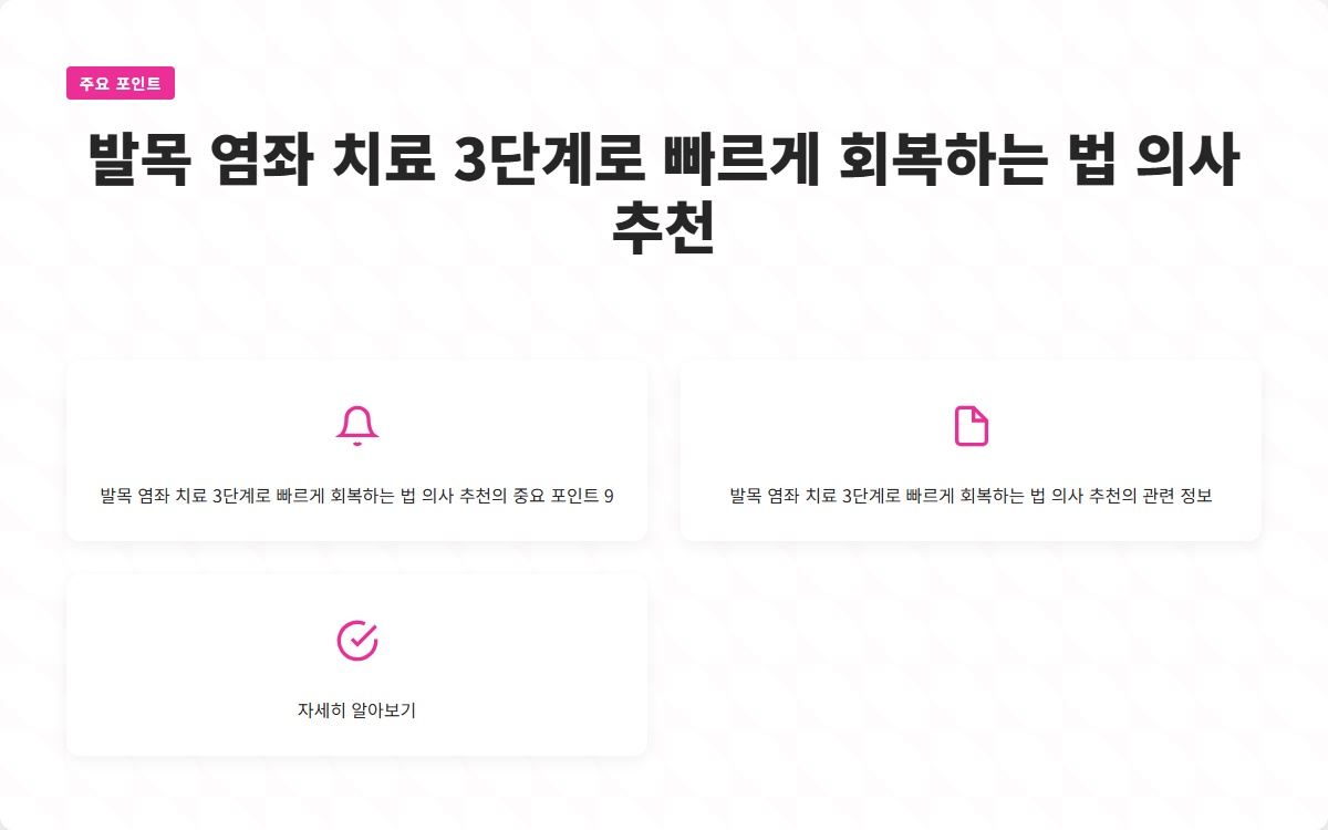 발목 염좌로 인한 통증은 많은 사람들에게 큰 불편을 초래합니다. 적절한 치료를 받지 않을 경우 만성적인 문제로 발전할 수 있습니다. 이번 포스트에서는 발목 염좌를 치료하기 위한 3단계 회복법을 소개합니다. 지금 확인해보세요!