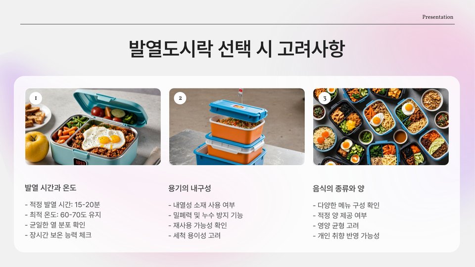 - 프리미엄 발열도시락: 고급스러운 디자인과 내구성 높인 소재로 만든 제품으로, 비즈니스 미팅에 적합합니다.