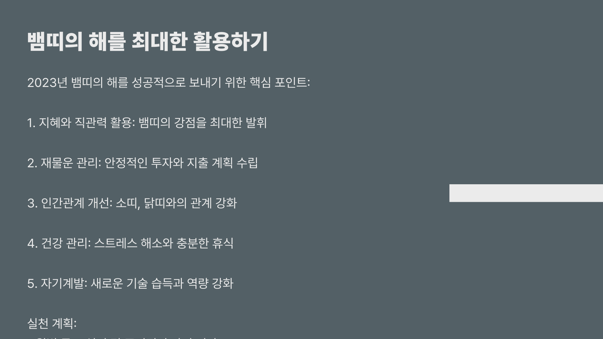뱀띠의 운세를 잘 활용하기 위해서는 자신의 특성을 이해하고, 이를 바탕으로 한 전략이 필요합니다. 예를 들어, 신비로운 성격을 활용하여 사람들과의 관계를 넓히거나 새로운 기회를 창출하는 것이 중요합니다. 또한, 긍정적인 마인드를 유지하고, 어려운 상황에서도 희망을 잃지 않는 것이 필요합니다. 자신의 운세를 알고 준비하는 것이 후회 없는 선택이 될 것입니다.