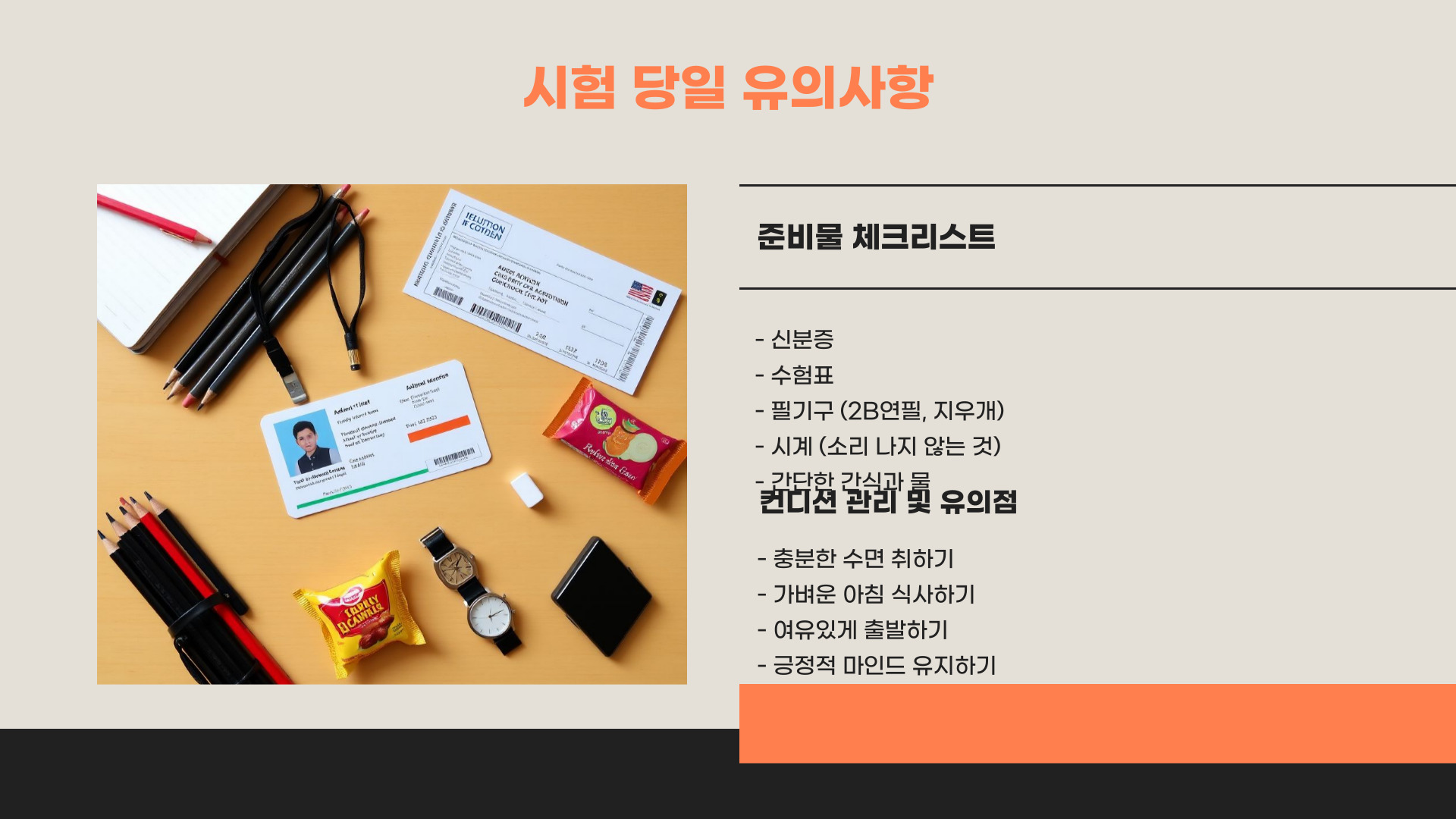 - 시험 당일의 전략과 주의 사항 숙지하기