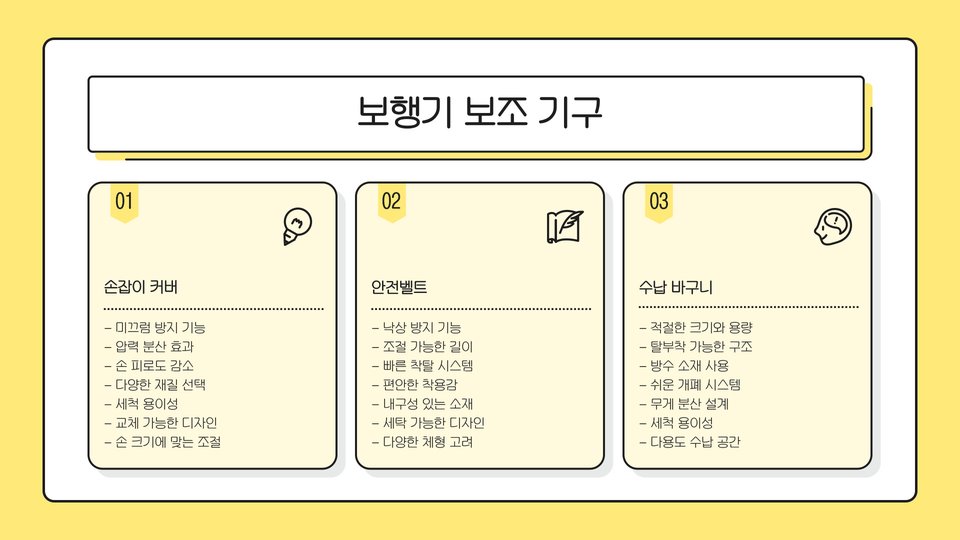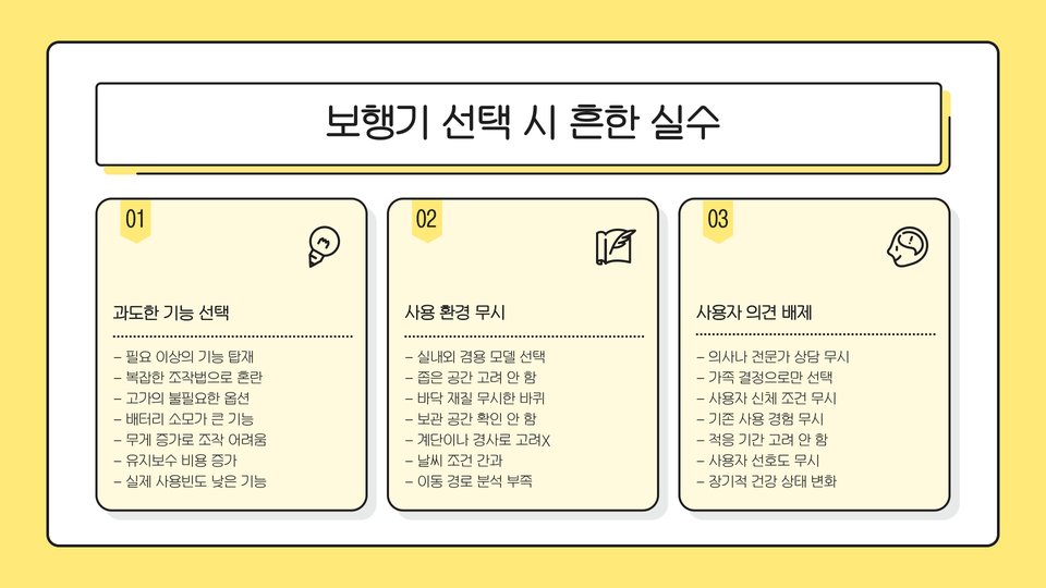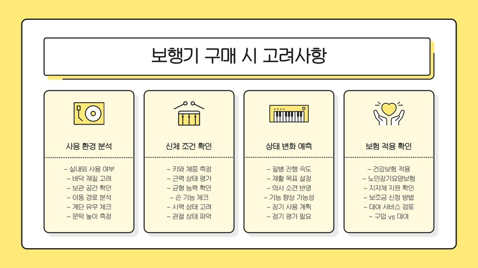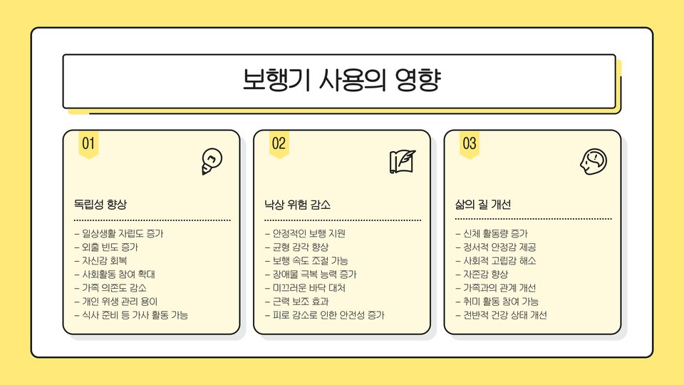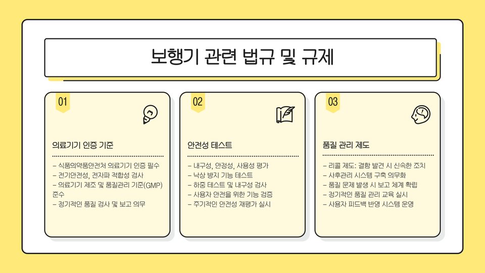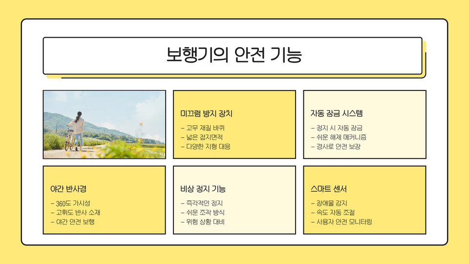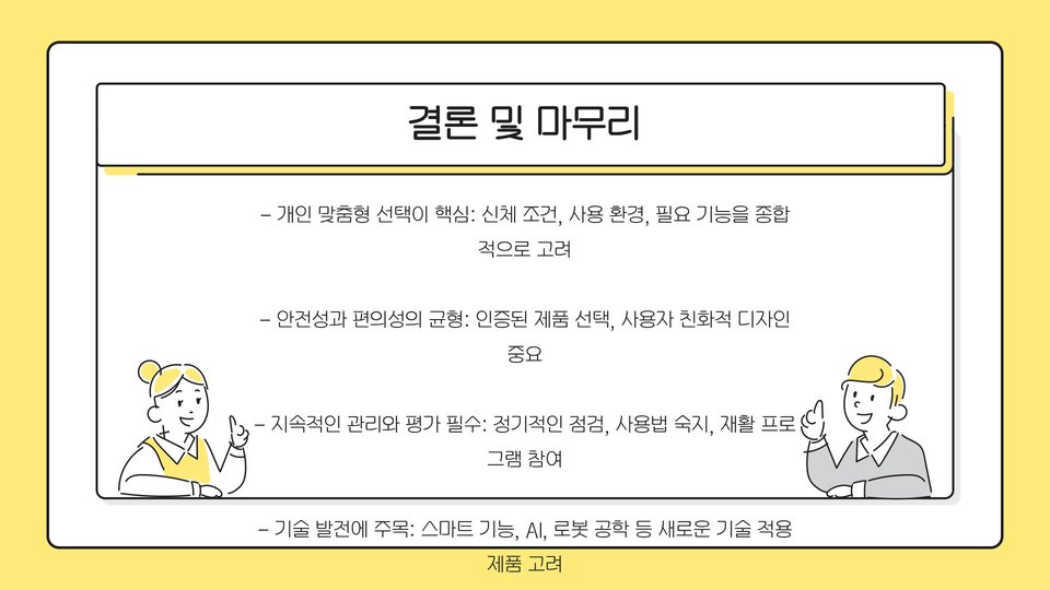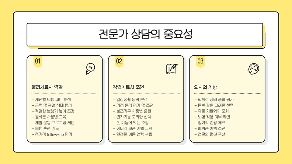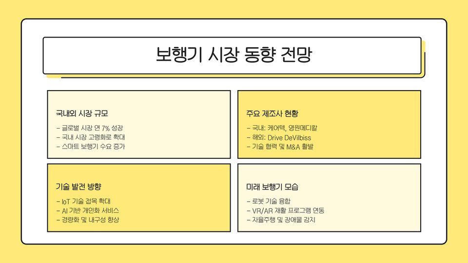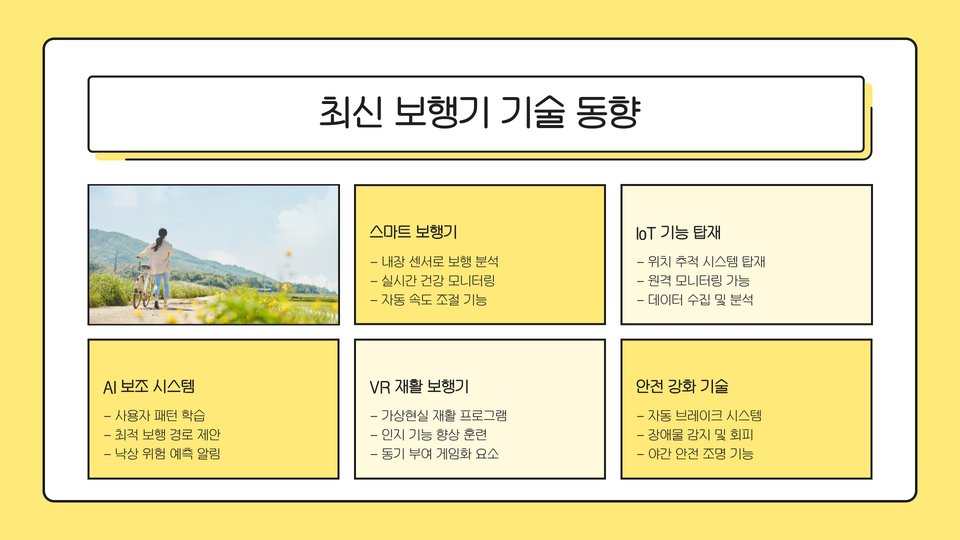 | 전동 보행기 | 장거리 이동, 속도 조절 |