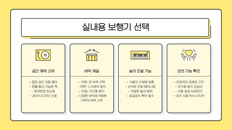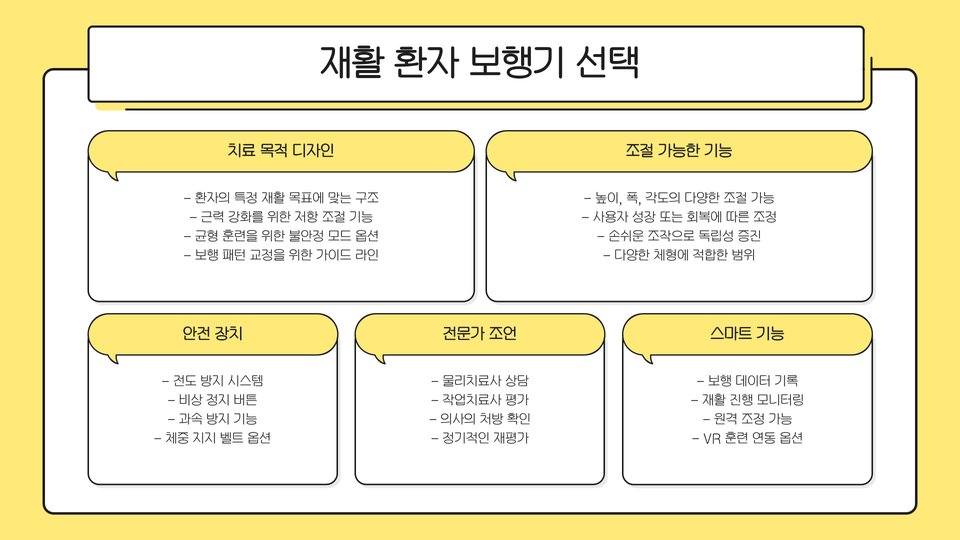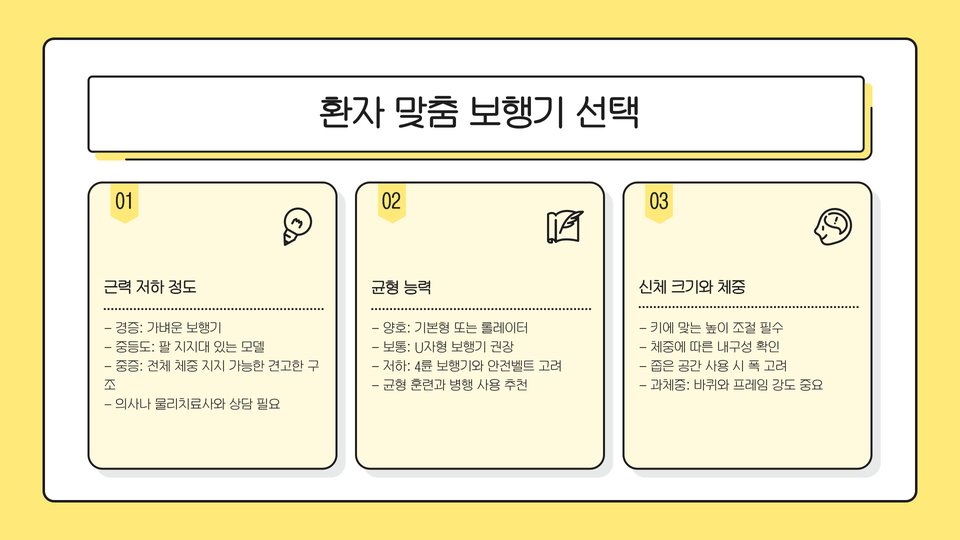 환자보행기를 선택할 때는 여러 가지 요소를 고려해야 합니다. 첫째, 환자의 신체적 상태를 평가해야 합니다. 예를 들어, 하체의 힘이 약한 환자에게는 안정적인 보행기가 필요할 수 있습니다. 둘째, 사용 환경도 중요한 요소입니다. 집 안에서 사용할 것인지, 외부에서 사용할 것인지에 따라 선택이 달라질 수 있습니다.