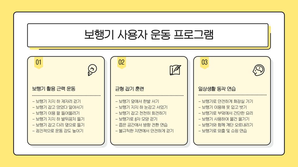 세 번째로는 전동 보행기를 추천합니다. 이 제품은 장거리 이동 시 편리하며, 자동으로 속도를 조절할 수 있어 편안한 사용을 보장합니다. 마지막으로, 접이식 보행기는 휴대성이 뛰어나며, 외출 시 간편하게 사용할 수 있습니다. 이러한 제품들은 모두 환자의 필요에 맞춰 선택할 수 있습니다.