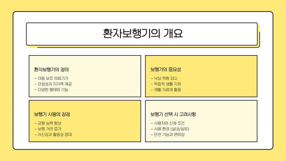 - 환자보행기는 이동성을 지원하는 필수적 기구입니다.