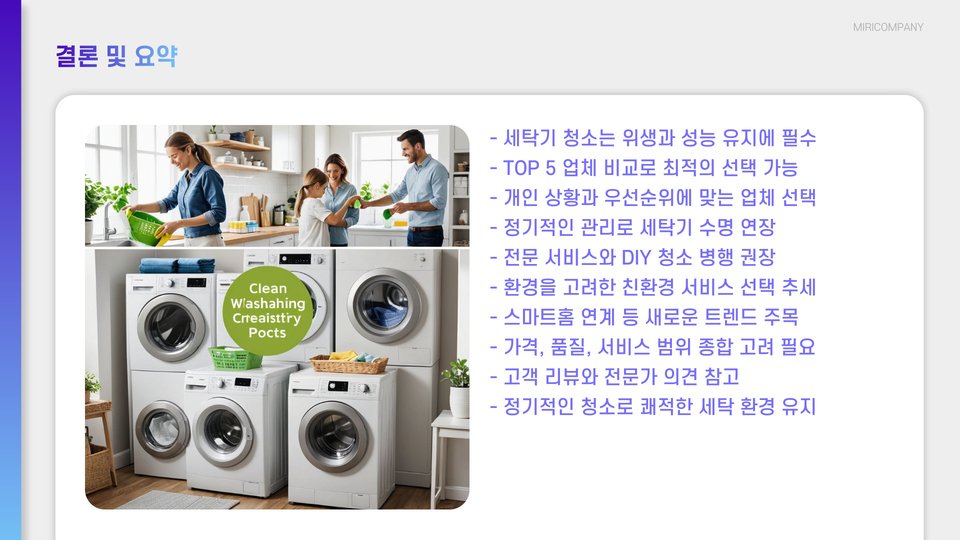 세탁기 청소업체를 선택하는 것은 매우 중요한 결정입니다. 각 업체의 특징과 고객 리뷰를 비교하여 최적의 선택을 하시기 바랍니다. 정기적인 청소를 통해 세탁기의 성능을 유지하고, 건강한 세탁 환경을 만드세요.