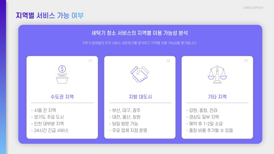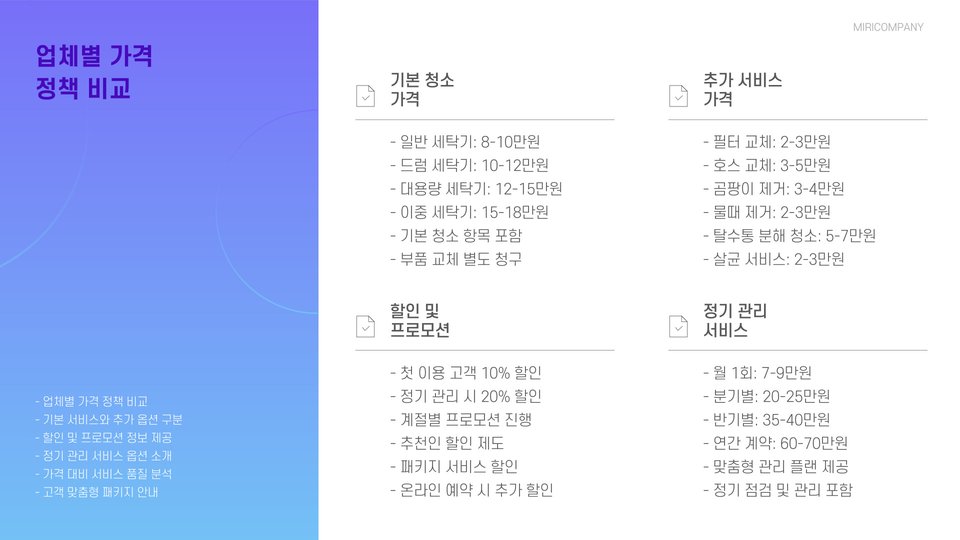 - 세탁기 청소 전문업체 A: 고객 만족도가 높고, 합리적인 가격으로 서비스 제공