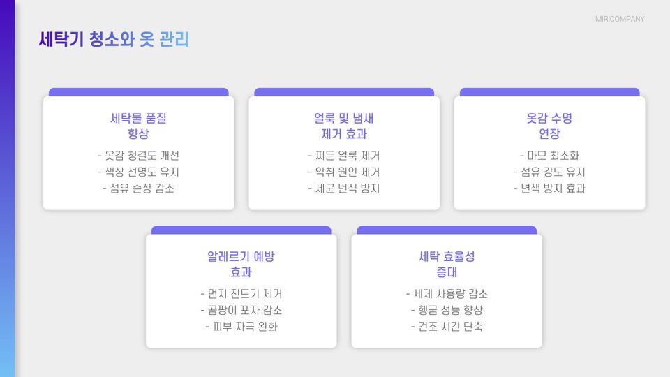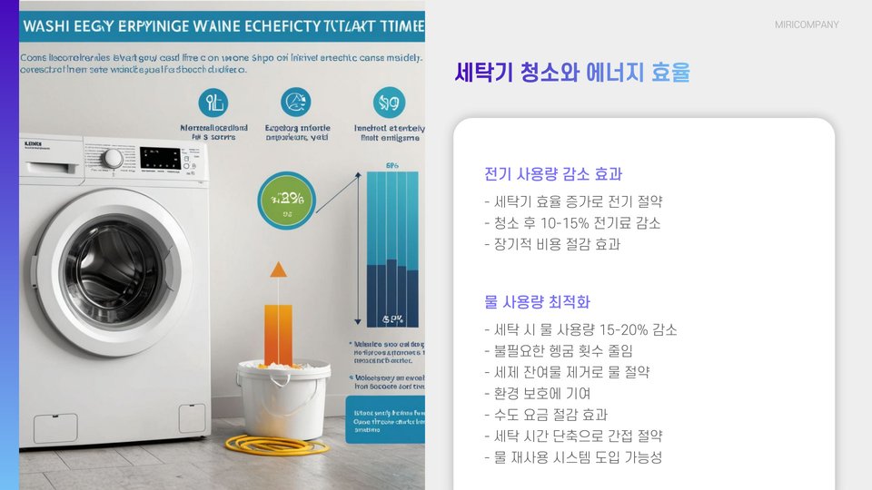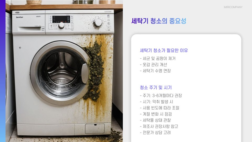 세탁기는 매일 사용되는 가전제품이므로 청결을 유지하는 것이 매우 중요합니다. 세탁기 내부에 물때와 세균이 쌓이면 세탁물의 냄새가 나거나 오염될 수 있습니다. 정기적으로 세탁기를 청소하면 세탁 효율이 높아지고 세탁물의 품질도 개선됩니다. 또한, 세탁기의 수명을 늘리는 데도 큰 도움이 됩니다.