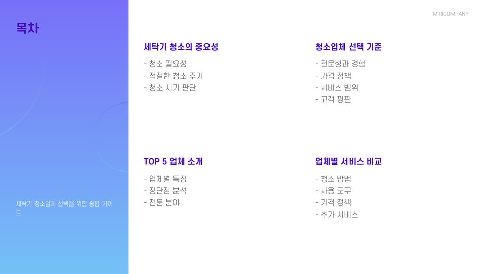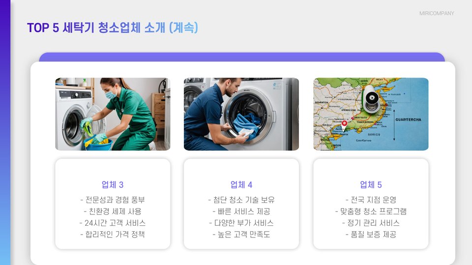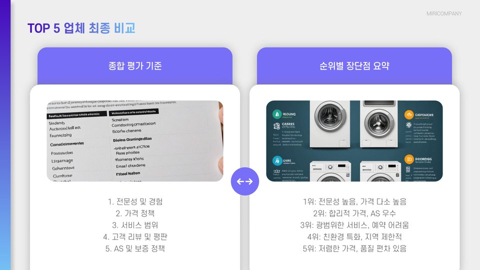 이제 본격적으로 TOP 5 세탁기 청소업체를 분석해 보겠습니다. 각 업체는 특별한 장점과 특징이 있으며, 여러분의 필요에 맞는 업체를 선택하는 데 도움이 될 것입니다.