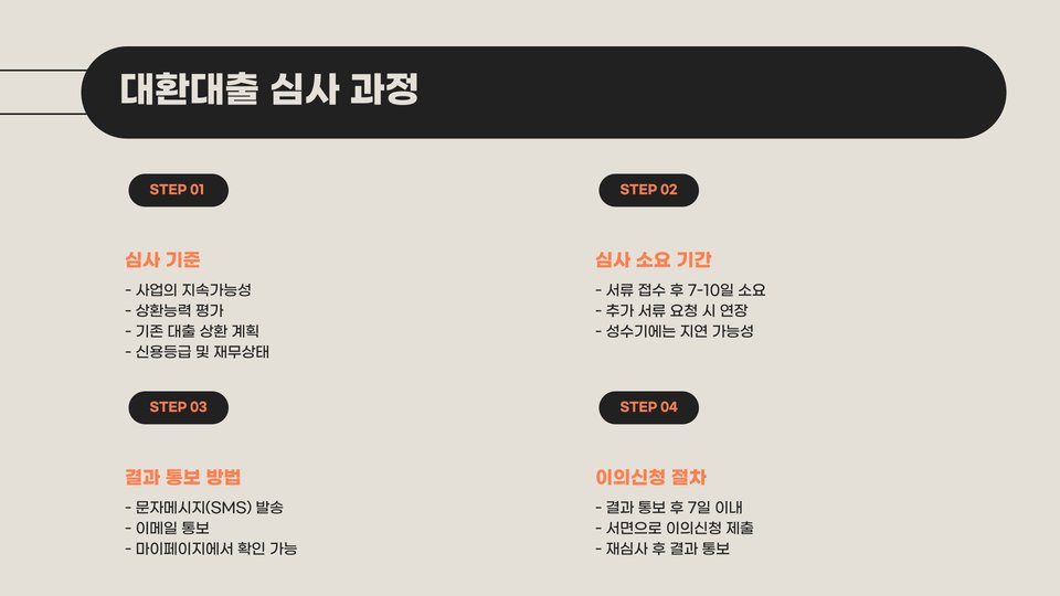 심사 결과에 따라 대환대출이 승인되면 필요한 자금을 신속하게 확보할 수 있습니다. 이는 소상공인의 경영 안정성에 기여하며, 경제 환경 변화에 탄력적으로 대응할 수 있도록 도와줍니다.