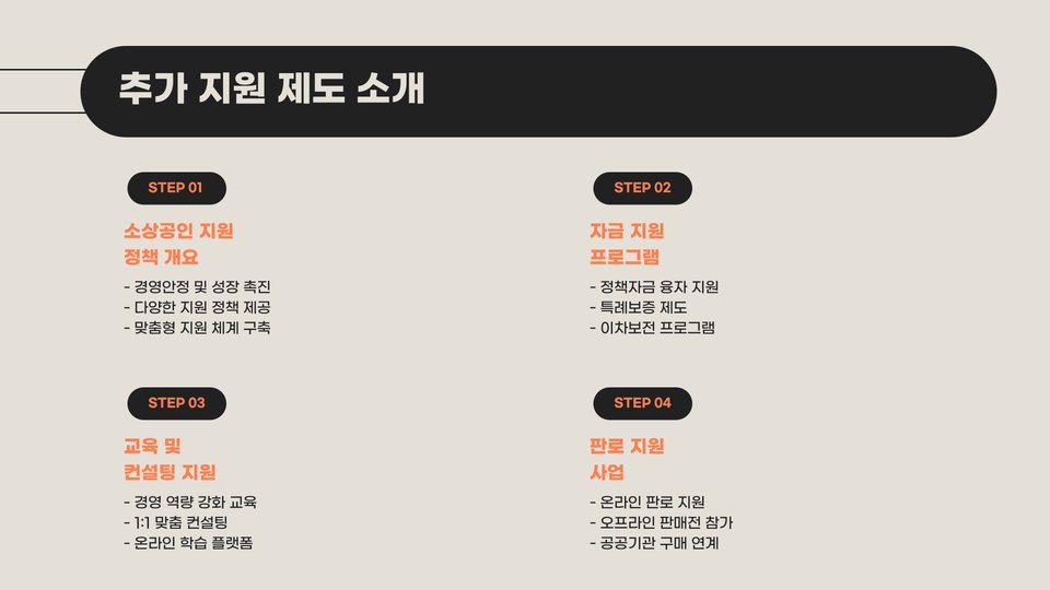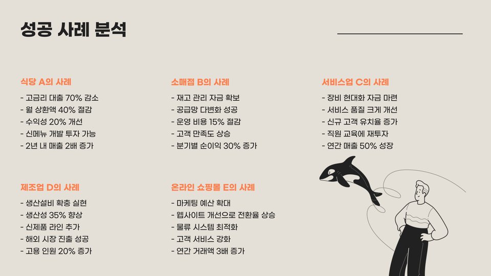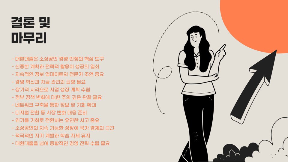 마지막으로 대환대출은 단순한 재정 지원에 그치지 않고, 소상공인들의 경영 전반에 대한 컨설팅 서비스 역시 제공하여, 보다 체계적인 사업 운영이 가능하게 돕습니다.