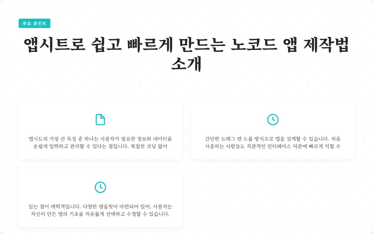 앱시트의 가장 큰 장점 중 하나는 드래그 앤 드롭 방식으로 앱을 제작할 수 있다는 점입니다. 이 방식은 사용자에게 친숙한 경험을 제공하며, 몇 번의 클릭만으로도 원하는 앱을 만들 수 있게 해줍니다.