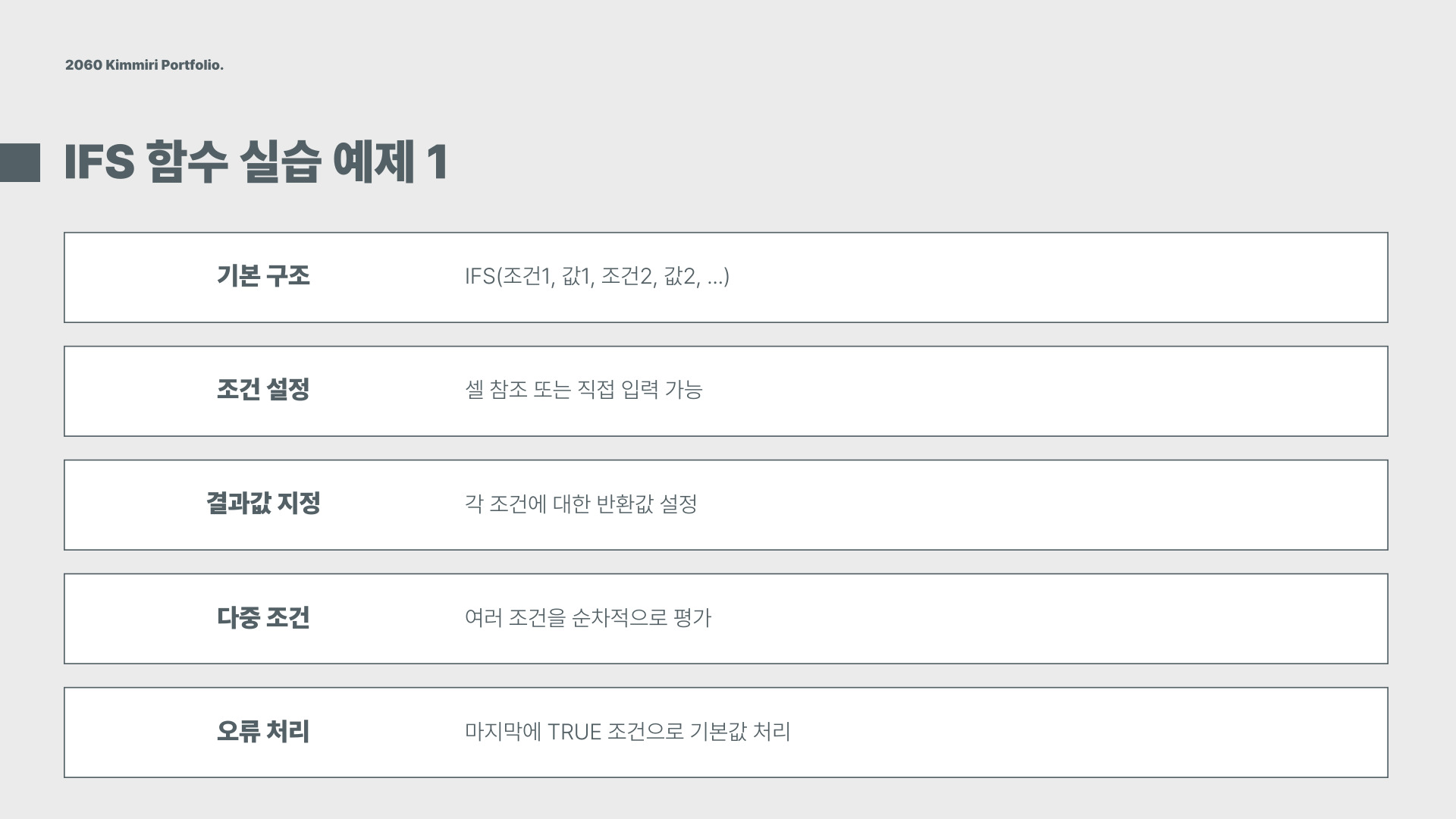 이럴 때, IFS 함수의 조건을 체계적으로 정리하여 사용하면 중복을 줄이고 의도치 않은 결과를 방지할 수 있습니다. 각 조건의 우선순위를 명확히 하여, 사용자에게 직관적으로 이해될 수 있도록 하시는 것이 중요합니다.