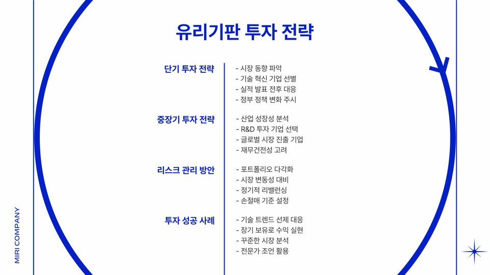 유리기판 관련주에 성공적으로 투자하기 위해서는 몇 가지 전략을 세워야 합니다. 첫째, 시장 조사입니다. 시장의 트렌드와 소비자의 선호를 조사하여, 유리기판의 수요가 증가할 가능성이 있는 기업에 투자하는 것이 좋습니다. 예를 들어, 최근 OLED 디스플레이의 인기가 높아짐에 따라 해당 기술에 강점을 가진 기업의 주식이 유망할 수 있습니다.