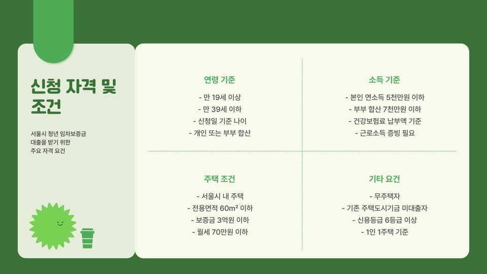 임차보증금 대출은 서울시가 정한 여러 가지 요건을 충족해야 신청할 수 있습니다. 예를 들어, 개인의 연소득이 4,000만원 이하여야 하며, 부부합산 소득은 5,000만원 이하로 제한됩니다. 더불어, 신청자는 반드시 무주택 세대주여야 하며, 다른 임차보증금 지원 사업에 신청 중일 경우 신청이 불가하다는 점도 유의해야 합니다.