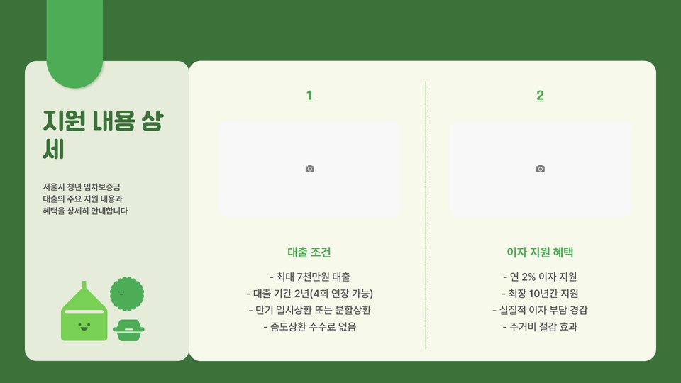 임차보증금 대출은 임대주택에 거주하는 청년들이 임차보증금을 마련할 수 있도록 지원하는 대출 상품입니다. 이 대출은 서울시가 직접 지원하며, 주택금융공사와 협력하여 운영됩니다. 대출 금액은 임대차 계약서에 명시된 보증금의 일정 비율까지 가능하며, 대출 상환 기간은 보통 2년에서 5년까지 다양합니다. 예를 들어, 1천만 원의 보증금이 필요하다면, 최대 800만 원까지 대출이 가능합니다.