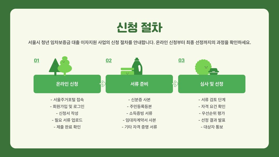 서울시 청년 임차보증금 대출은 비교적 간단한 신청 절차를 통해 진행됩니다. 먼저, 서울시 청년 지원센터 또는 해당 구청의 관련 부서에서 제공하는 안내를 통해 자세한 정보를 확인할 수 있습니다. 신청서에는 개인 정보와 소득 증빙 자료 등을 함께 제출해야 하며, 이자 지원도 포함되어 있어 대출을 이용하는 청년들에게 경제적 부담이 더욱 줄어듭니다.