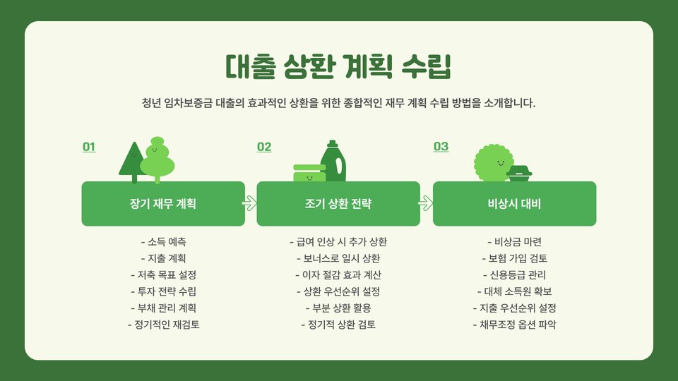 대출 금액이 승인되면, 청년들은 정해진 기간 동안 대출금을 상환해야 합니다. 이자율은 변동이 있을 수 있으나, 대체로 1.5%~3.0% 사이로 책정됩니다. 상환 방법은 원리금 균등 분할 상환이 기본이며, 필요에 따라 조정이 가능할 수 있습니다. 대출 상환이 어려울 경우, 서울시는 재정 지원이나 상환 유예 등의 추가 지원도 고려하고 있습니다. 이를 통해 청년들이 좀 더 안정적으로 주거를 유지할 수 있도록 돕고 있습니다.