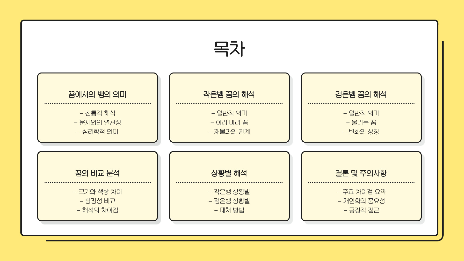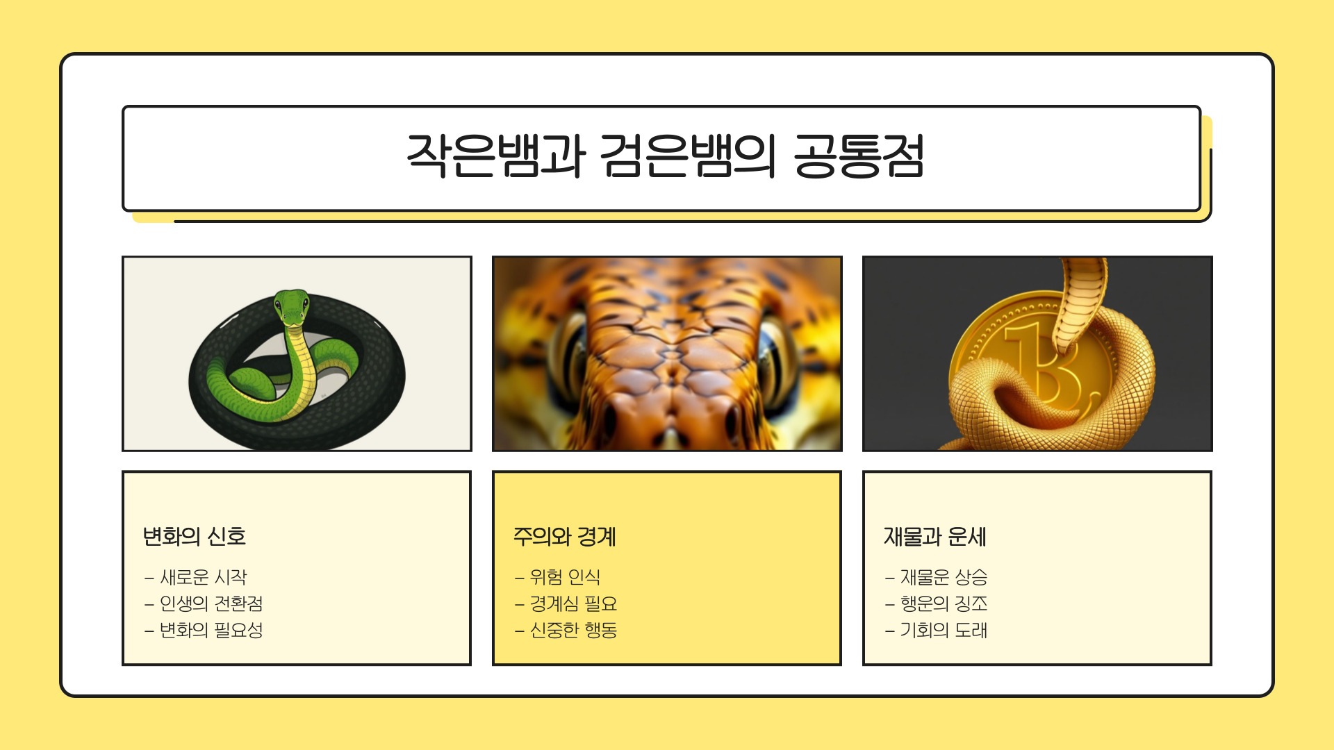 두 꿈 모두 자기 성찰의 기회를 제공하지만, 작은뱀의 꿈은 긍정적인 변화나 성장을 나타내는 반면, 검은뱀의 꿈은 내면의 불안을 인식하고 해결하는 과정을 요구합니다. 이러한 구별을 통해 꿈의 의미를 보다 명확하게 이해할 수 있습니다.
