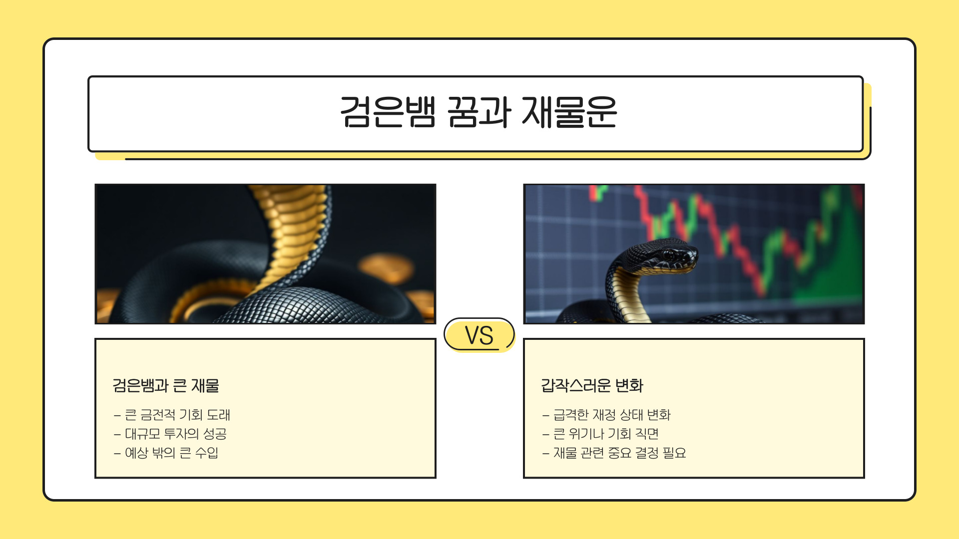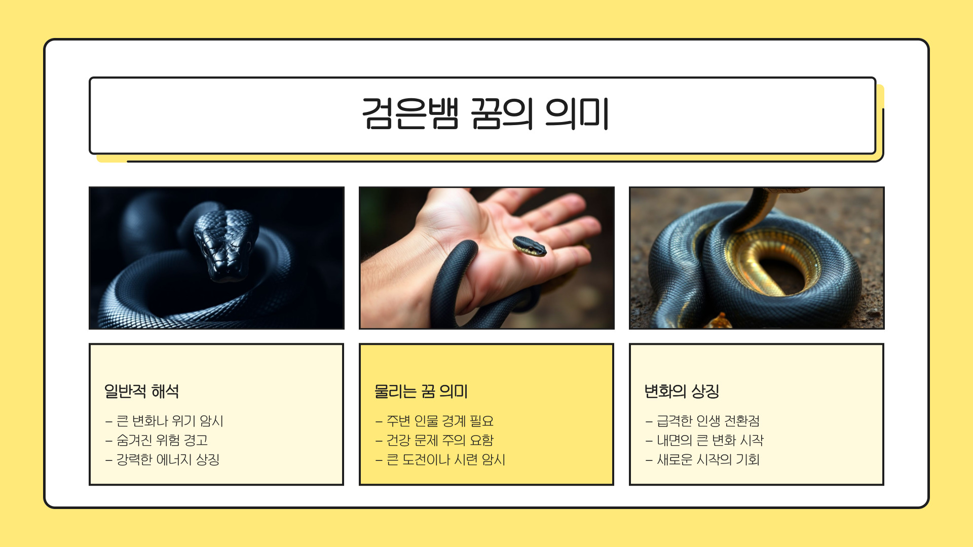 - 검은뱀은 위험과 불안을 상징하며, 경고의 의미를 지닌다.