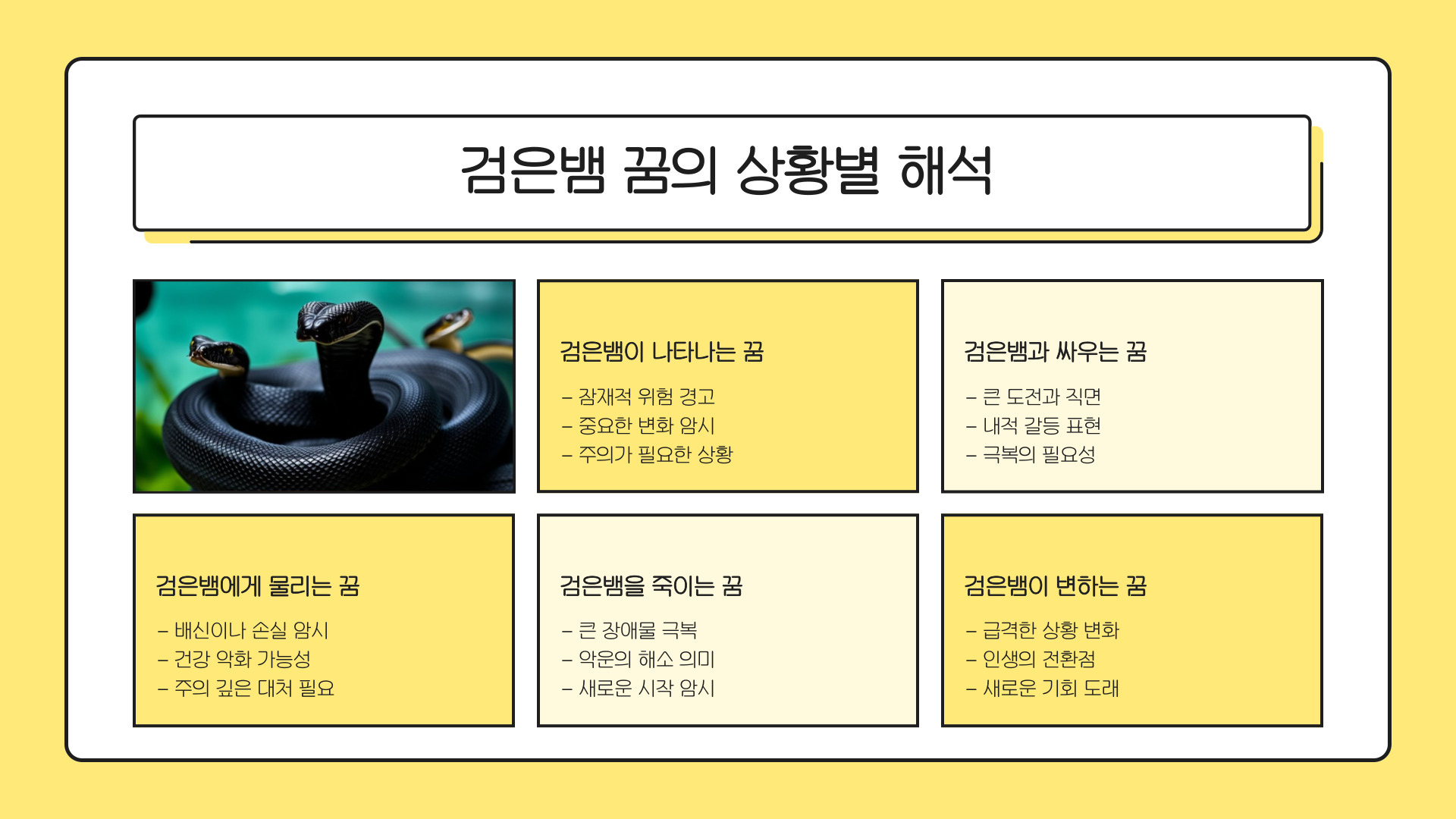 - 검은뱀은 두려움, 갈등, 트라우마를 반영하며 주의가 필요합니다.