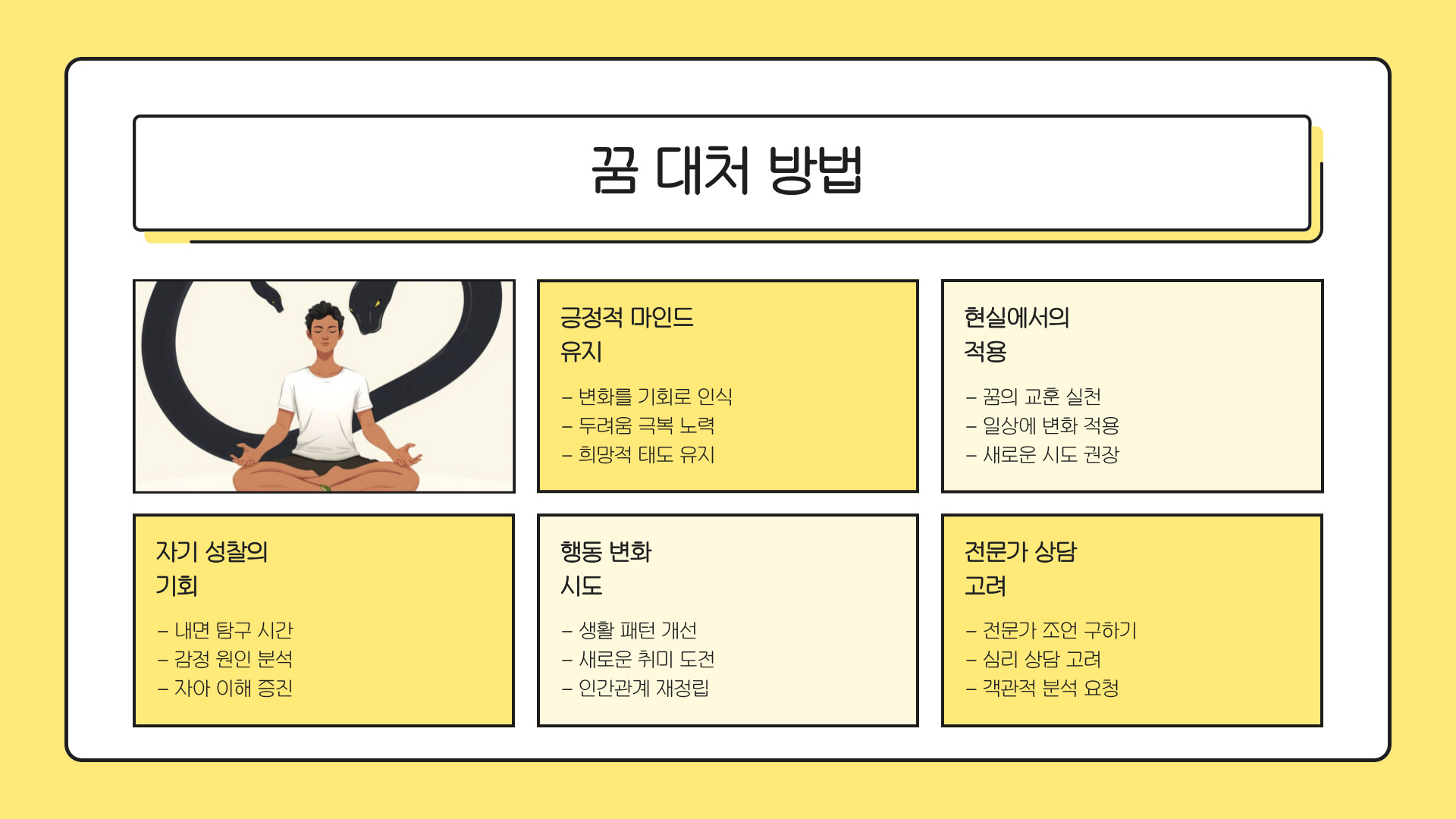 - 각 뱀은 꿈을 꾸는 사람의 감정 상태와 연결되어 해석되어야 합니다.