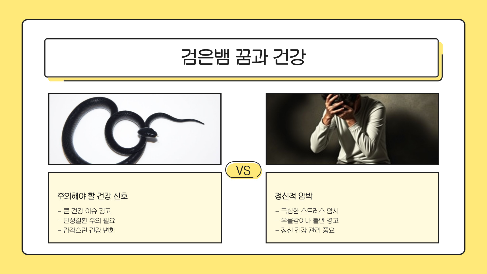 검은뱀은 종종 부정적인 감정이나 위협을 나타내는 경우가 많아 주의가 필요합니다. 꿈속에서 검은뱀을 만나면, 이는 내면의 두려움이나 불안, 심지어는 트라우마를 상징할 수 있습니다. 더구나 검은뱀은 신비와 무의식을 나타내며, 감춰진 문제와 대면해야 할 시점을 알릴 수 있습니다.