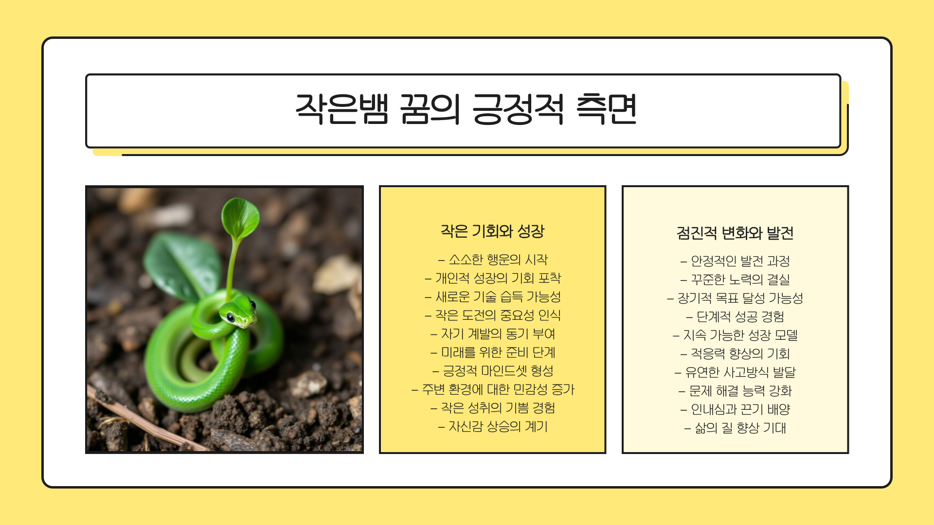 - 작은뱀은 사소한 문제를 상징하며, 긍정적인 메시지를 전달할 수 있다.