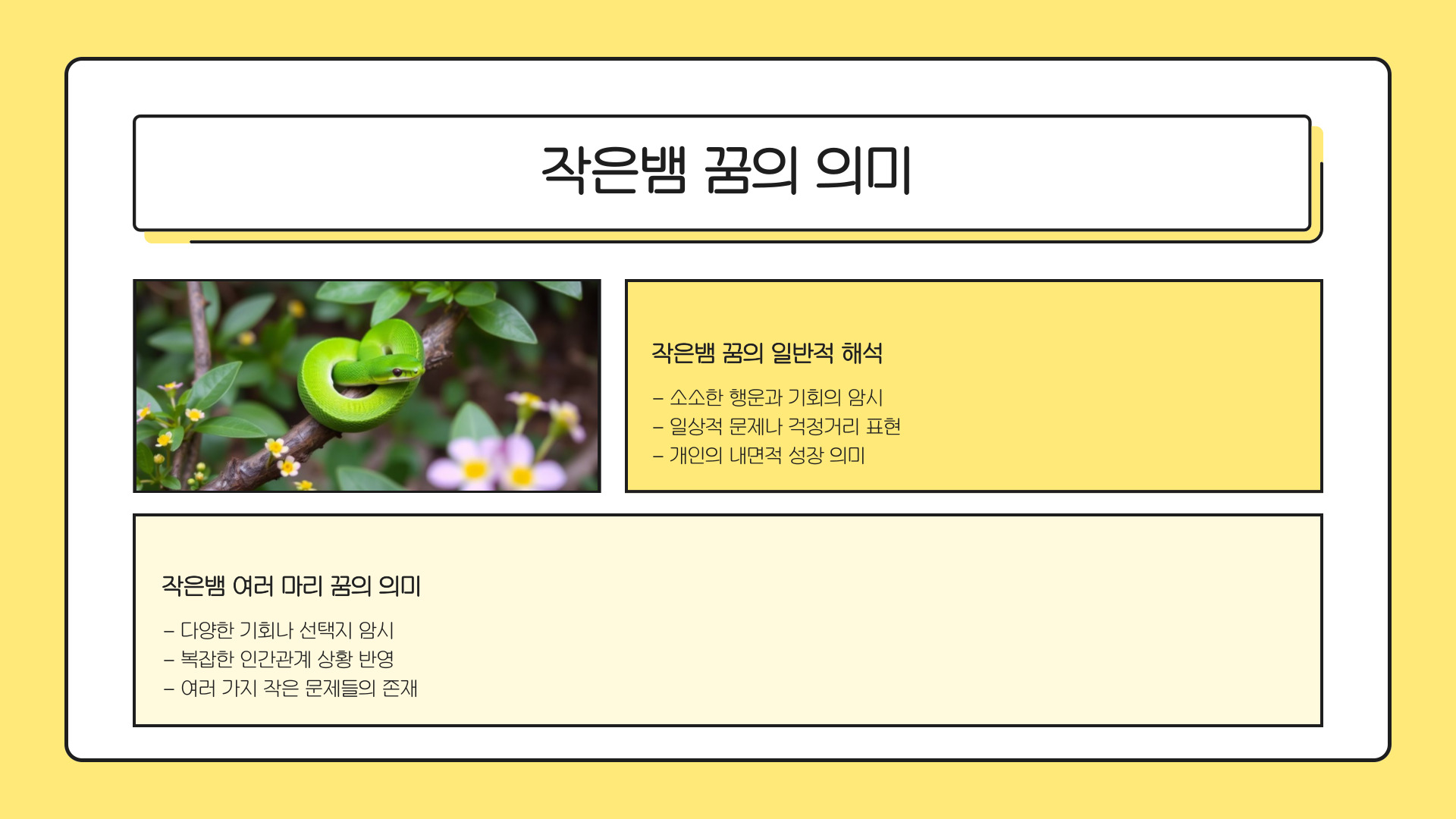 - 작은뱀은 사소한 문제를 상징하며, 긍정적인 메시지를 전달할 수 있다.
