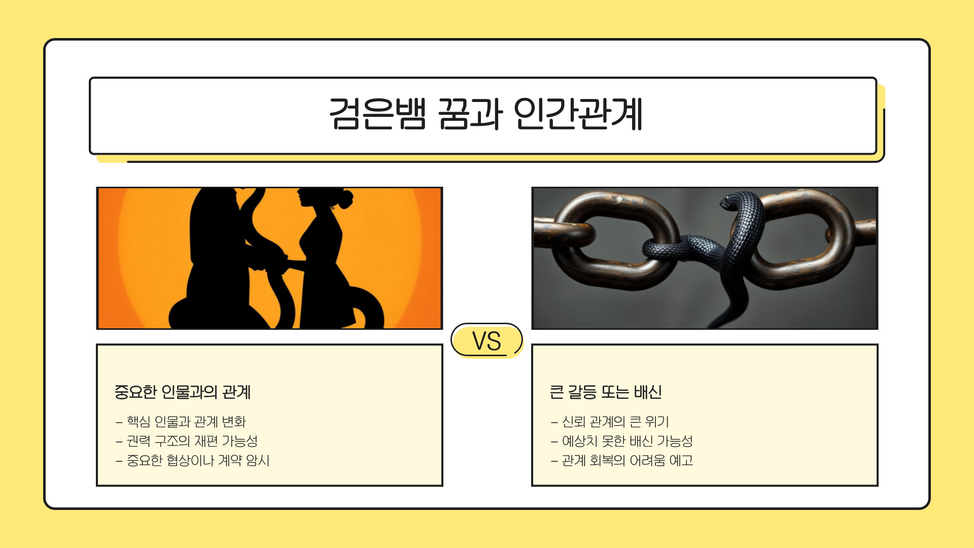 - 검은뱀은 두려움, 갈등, 트라우마를 반영하며 주의가 필요합니다.