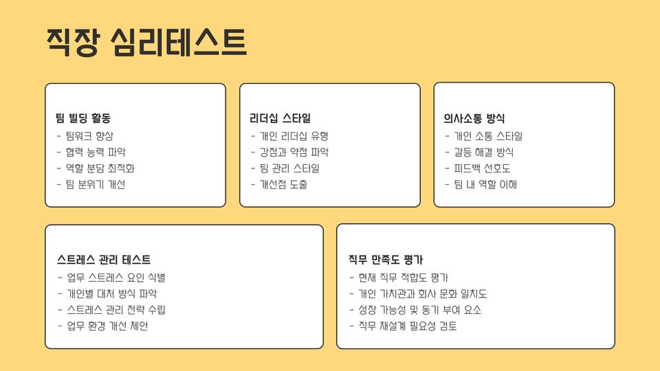 또한, 스트레스 수준 테스트와 같은 심리테스트는 개인의 감정 상태를 파악하고 스트레스 관리 방법을 모색하는 데 유용합니다. 이런 테스트는 간단하고 직관적이어서 누구나 쉽게 참여할 수 있습니다.