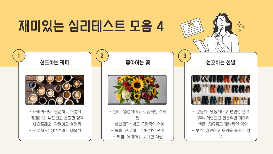 재밌는 심리테스트는 자기 이해를 돕고, 친구들과의 소통의 기회가 될 수 있습니다. 여러 가지 테스트를 통해 자신을 돌아보고, 새로운 사실을 발견해 보세요. 재미있고 유익한 경험이 될 것입니다!