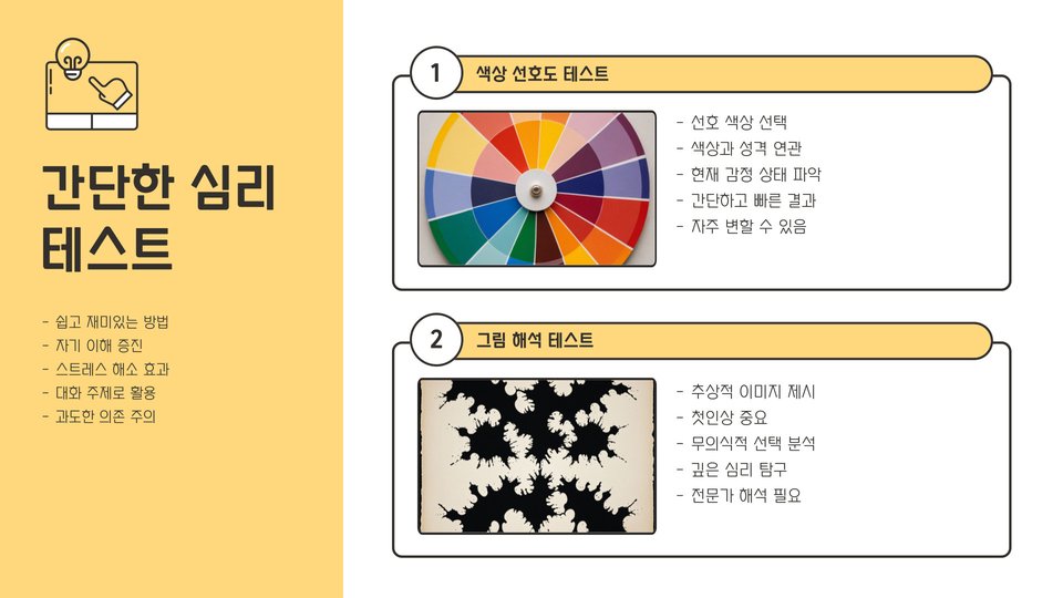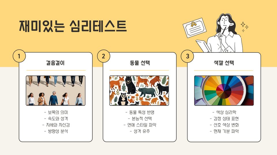 재밌는 심리테스트는 자기 이해를 돕고, 친구들과의 소통의 기회가 될 수 있습니다. 여러 가지 테스트를 통해 자신을 돌아보고, 새로운 사실을 발견해 보세요. 재미있고 유익한 경험이 될 것입니다!
