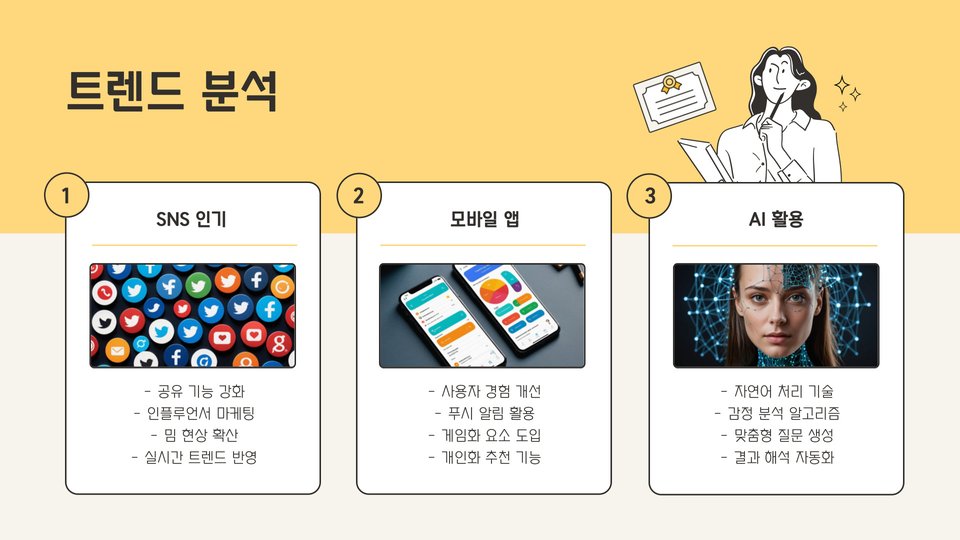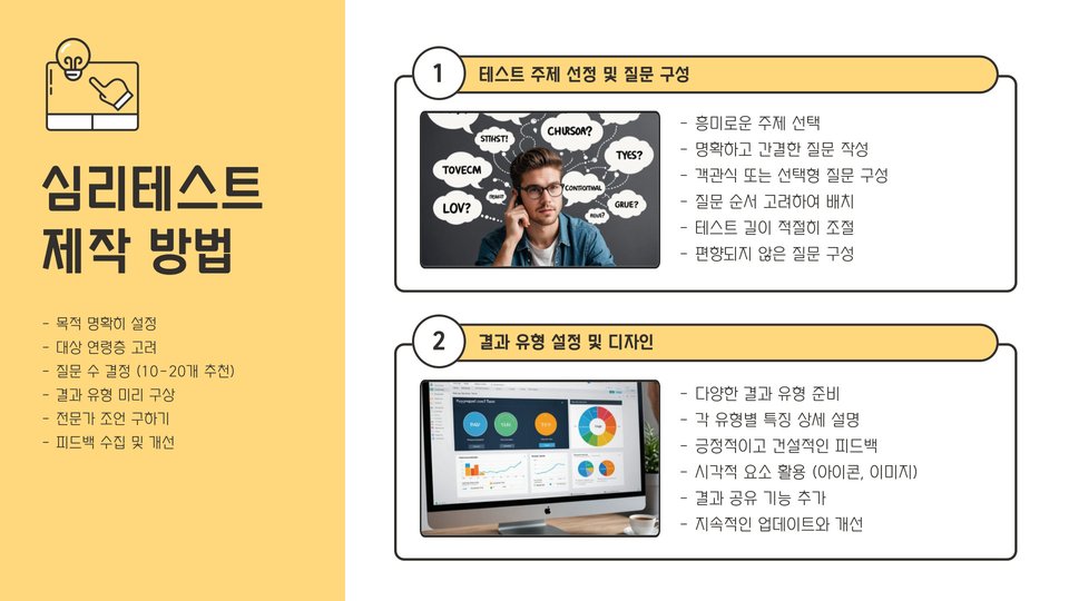 마지막으로, 심리적 취향 분석 테스트도 인기 있는 유형 중 하나입니다. 이는 개인의 취향이 어떤 경향이 있는지를 파악하는 데 도움을 줍니다. 예를 들어, 어떤 색상을 선호하는지 질문하면서 개인의 심리적 성향을 분석할 수 있습니다.
