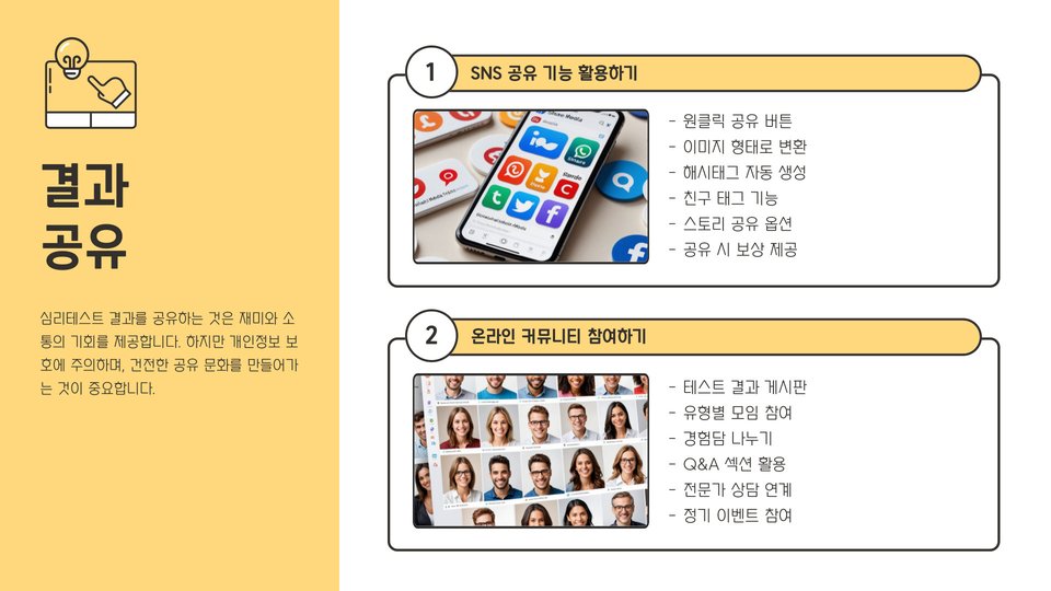 셋째, 심리테스트를 진행할 때는 편안한 마음가짐이 필요합니다. 자신에게 솔직하고 진정한 감정을 표현하는 것이 중요합니다. 마지막으로, 테스트 후 결과를 친구들과 공유해보세요. 서로의 결과를 비교하면서 흥미로운 대화를 나눌 수 있습니다.