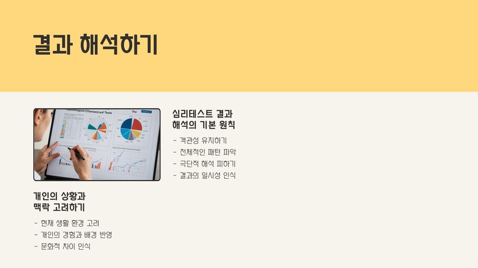 심리테스트의 결과는 항상 신중하게 해석해야 합니다. 결과를 읽을 때는 자신의 상황과 감정을 고려하여 분석하는 것이 중요합니다. 예를 들어, 성격 유형 검사에서 '외향적'이라는 결과가 나왔다면, 이는 당신이 사회적 상호작용을 즐긴다는 것을 의미합니다.