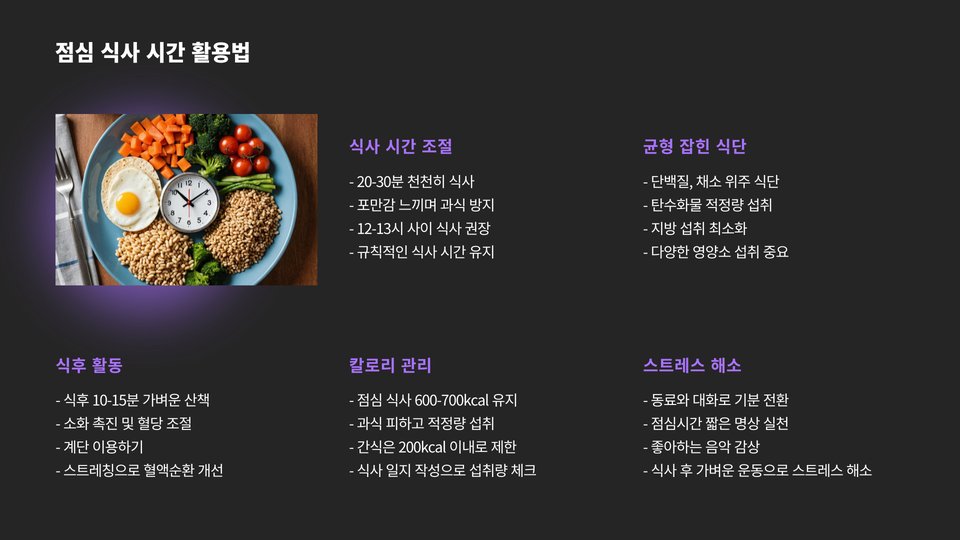 - 신선한 과일, 채소, 단백질 중심의 식단