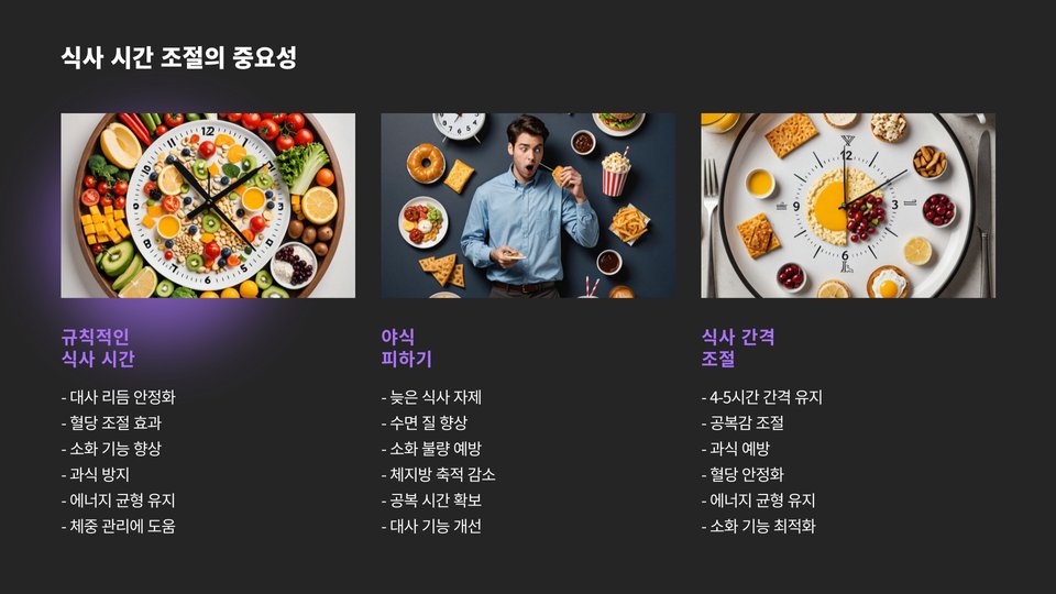 식사 시에는 적절한 양을 섭취하고, 소식을 통해 체중 조절을 돕는 것이 중요합니다. 또한, 충분한 수분 섭취도 필수입니다. 물은 대사를 촉진시키고, 체내 노폐물을 제거하는 데 도움을 줍니다. 하루 2리터 이상 물을 마시는 것을 추천합니다.