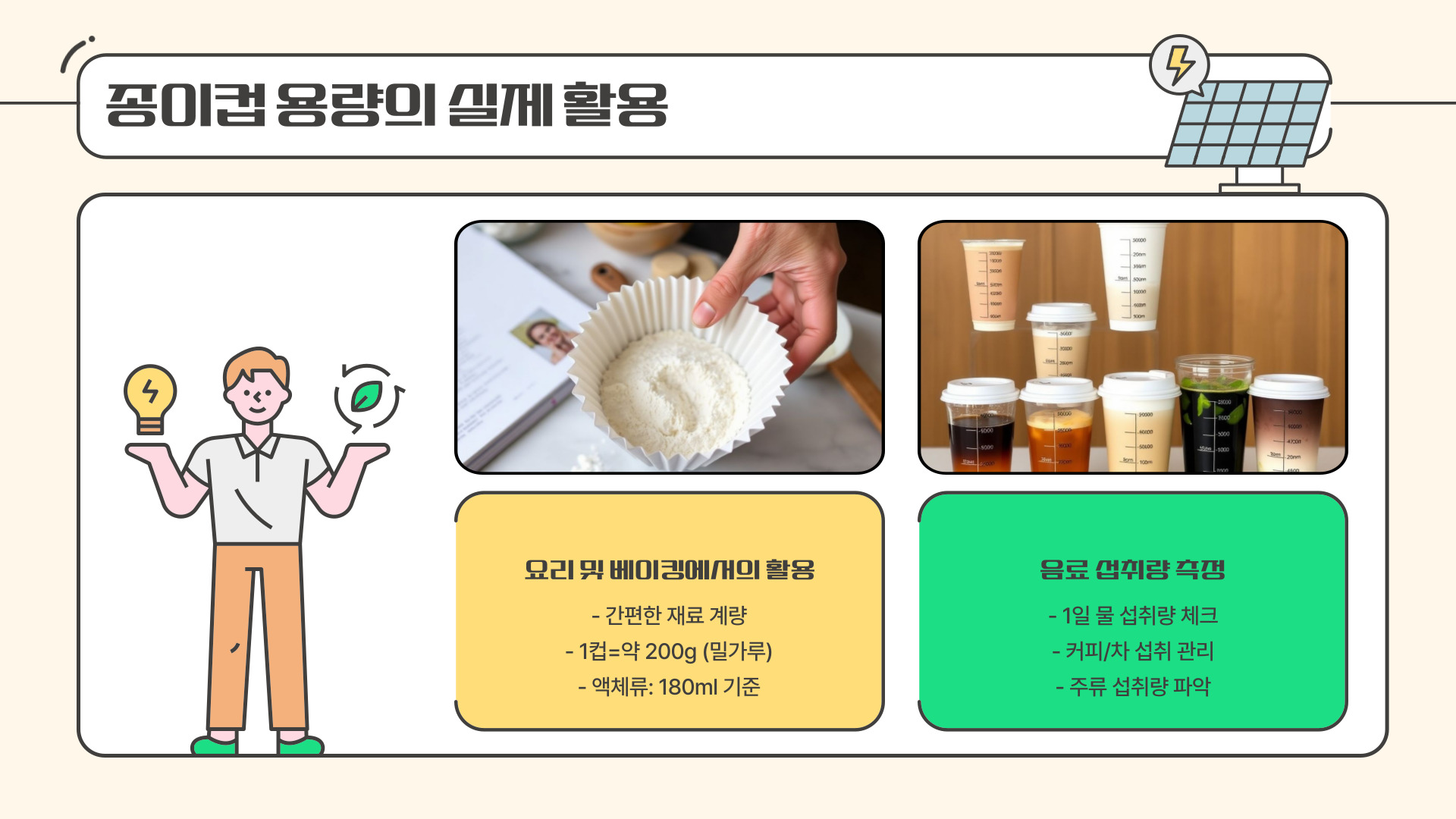 종이컵의 1컵 당 용량을 잘 이해하면, 음료 제공 이외에도 다양한 활용 방법이 있습니다. 예를 들어, 요리에서 재료 계량에 활용할 수 있습니다. 음식 조리 시 정확한 양을 맞추는 것이 중요하므로 종이컵을 재료 계량 도구로 활용할 수 있습니다. 물, 쌀, 밀가루 등 다양한 재료를 측정하는 데 유용합니다.